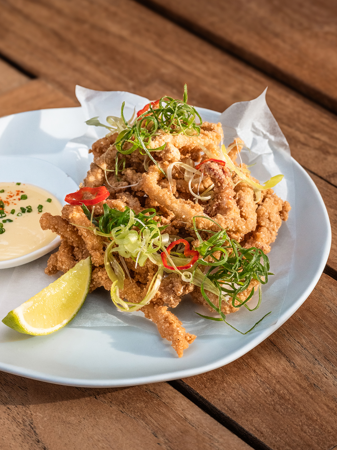 Calamares fritos al estilo pucusana con emulsión de lima y pescado.