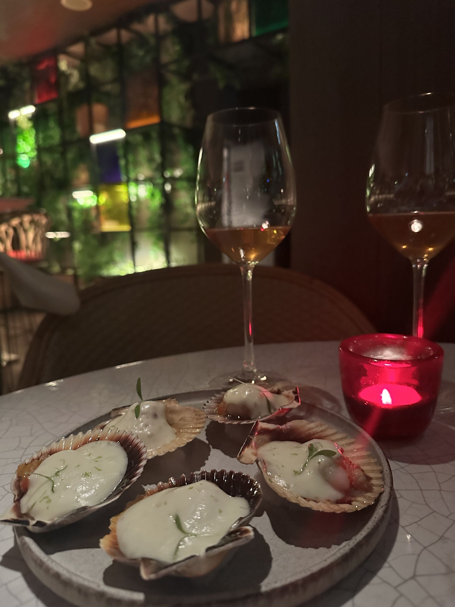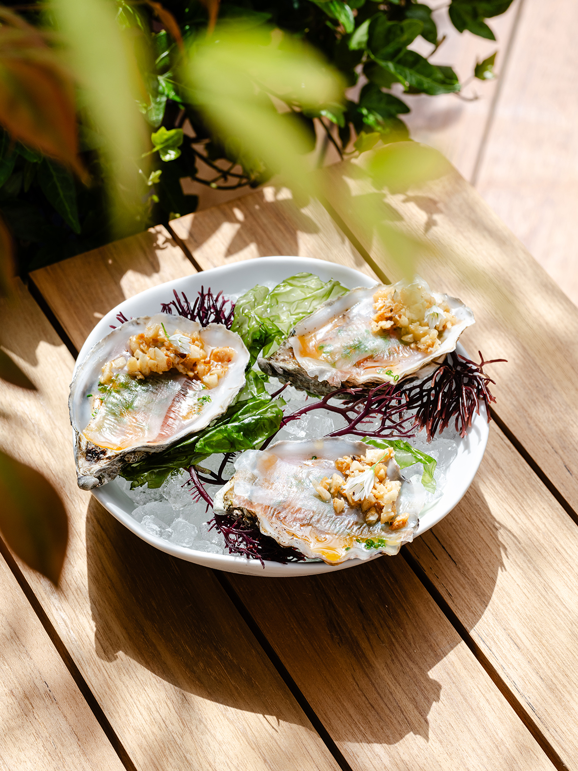 Ostras, leche de tigre, aceite de limo soasado, castañas tostadas, recubiertas con lardo Joselito.
