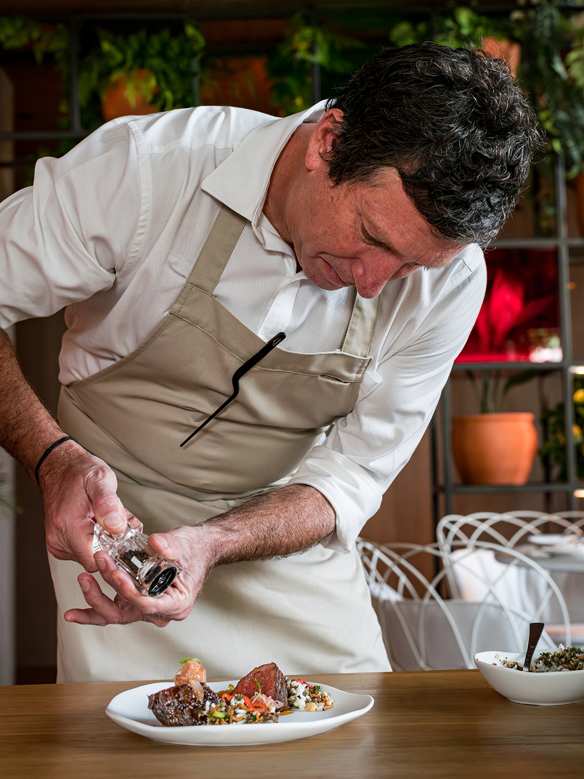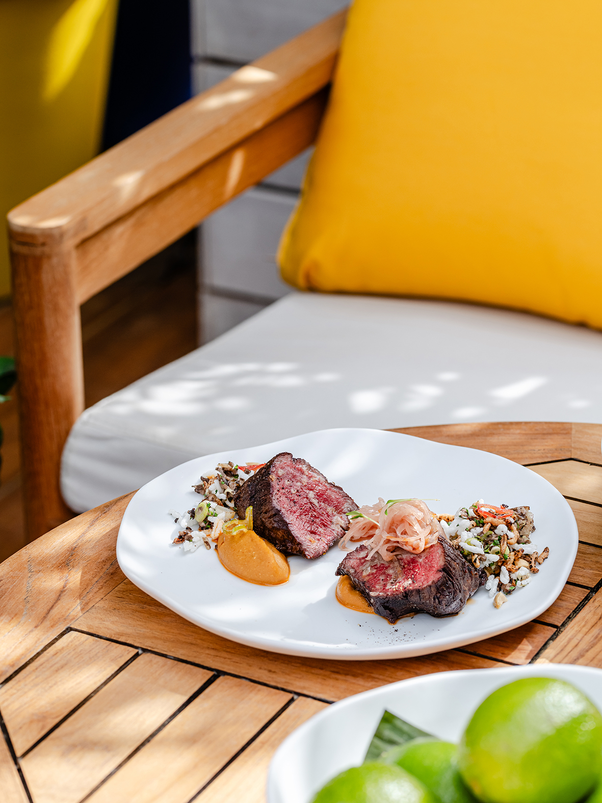 Solomillo a la parrilla, crema de choclo, cebollas encurtidas y arroz frito.