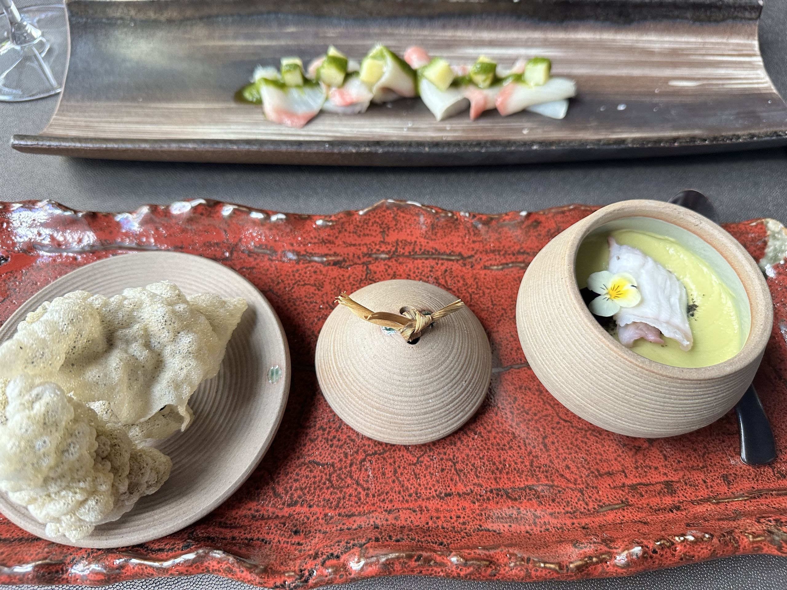 Usuzukuri de hamachi con mojo verde y papa arrugá y pulpo con aguachile de cenizas y aguacate, pepino y sunomono.