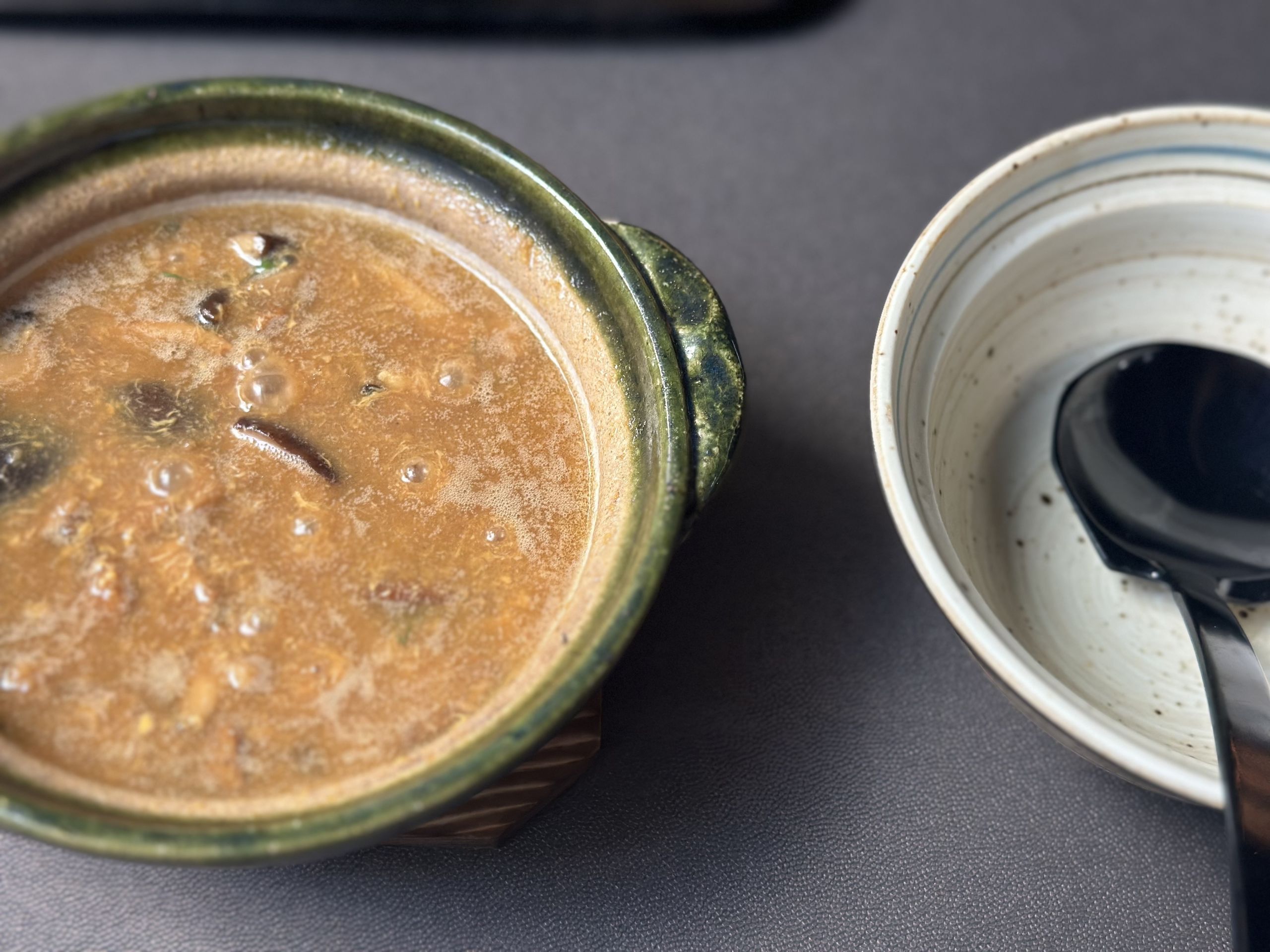 Arroz frito con setas y sukiyaki, hecho al wok y frito con mantequilla clarificada en el que el mix de setas son shitake y lengua de vaca. Lo acompañan con una yema de huevo y cebolleta y te lo terminan de preparar en la mesa.
