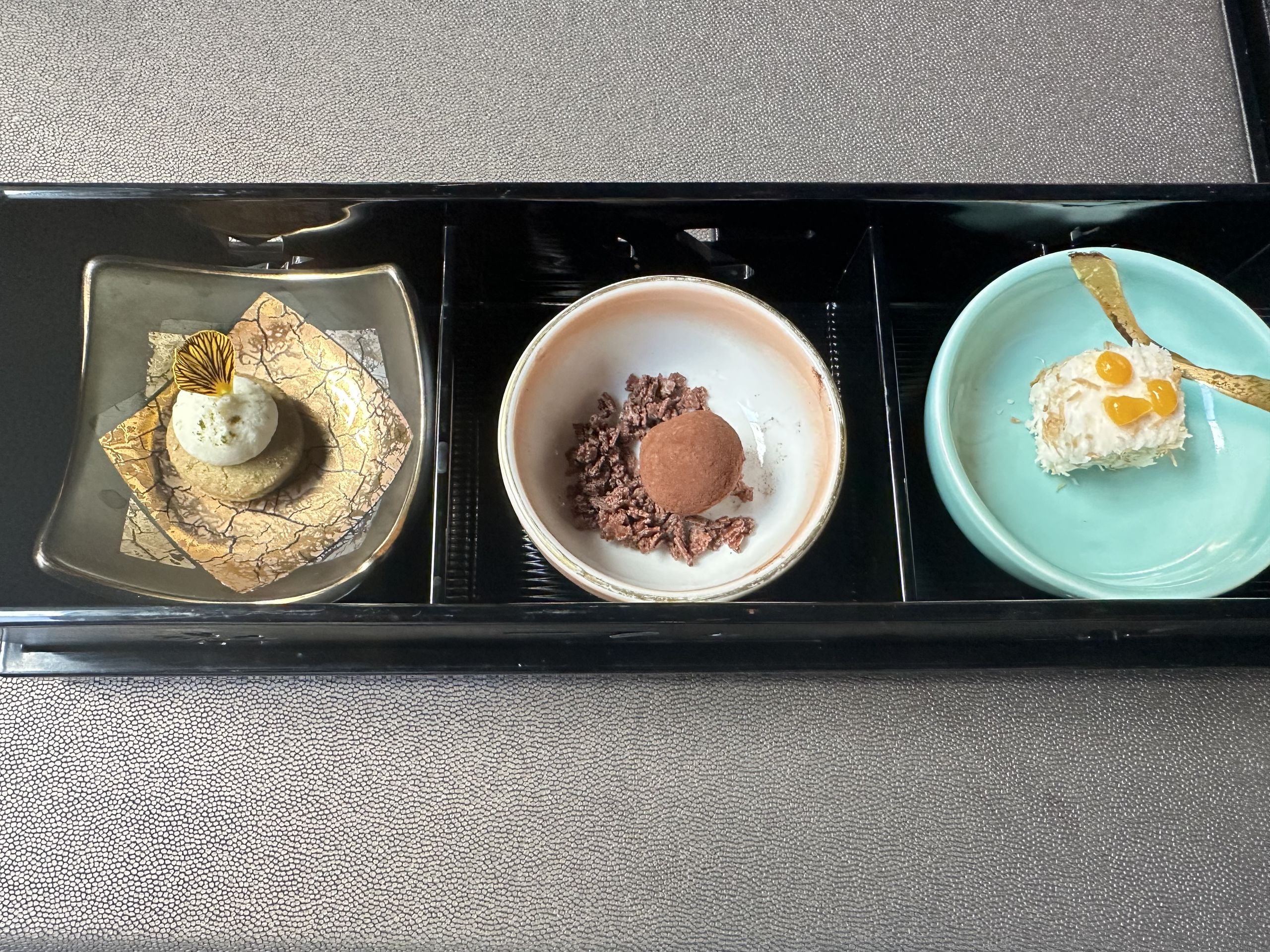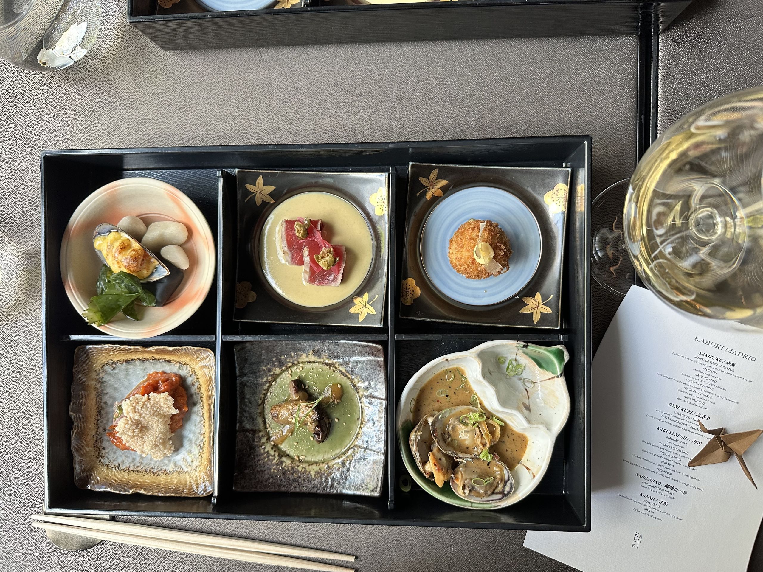 Bento box con mejillón con curry y miso; tataki de atún con salsa tonnato; croqueta japonesa de atún con mayonesa japonesa, tare y katsuobushi; galleta de arroz crujiente, ventresca de atún y salsa pastor; berenjenas con miso, chalota y sésamo; y almejas con salsa chilli jam.