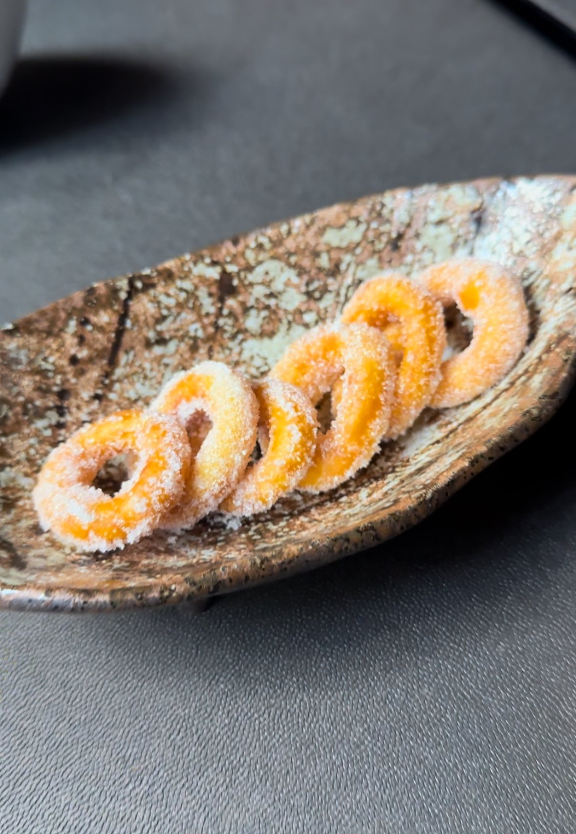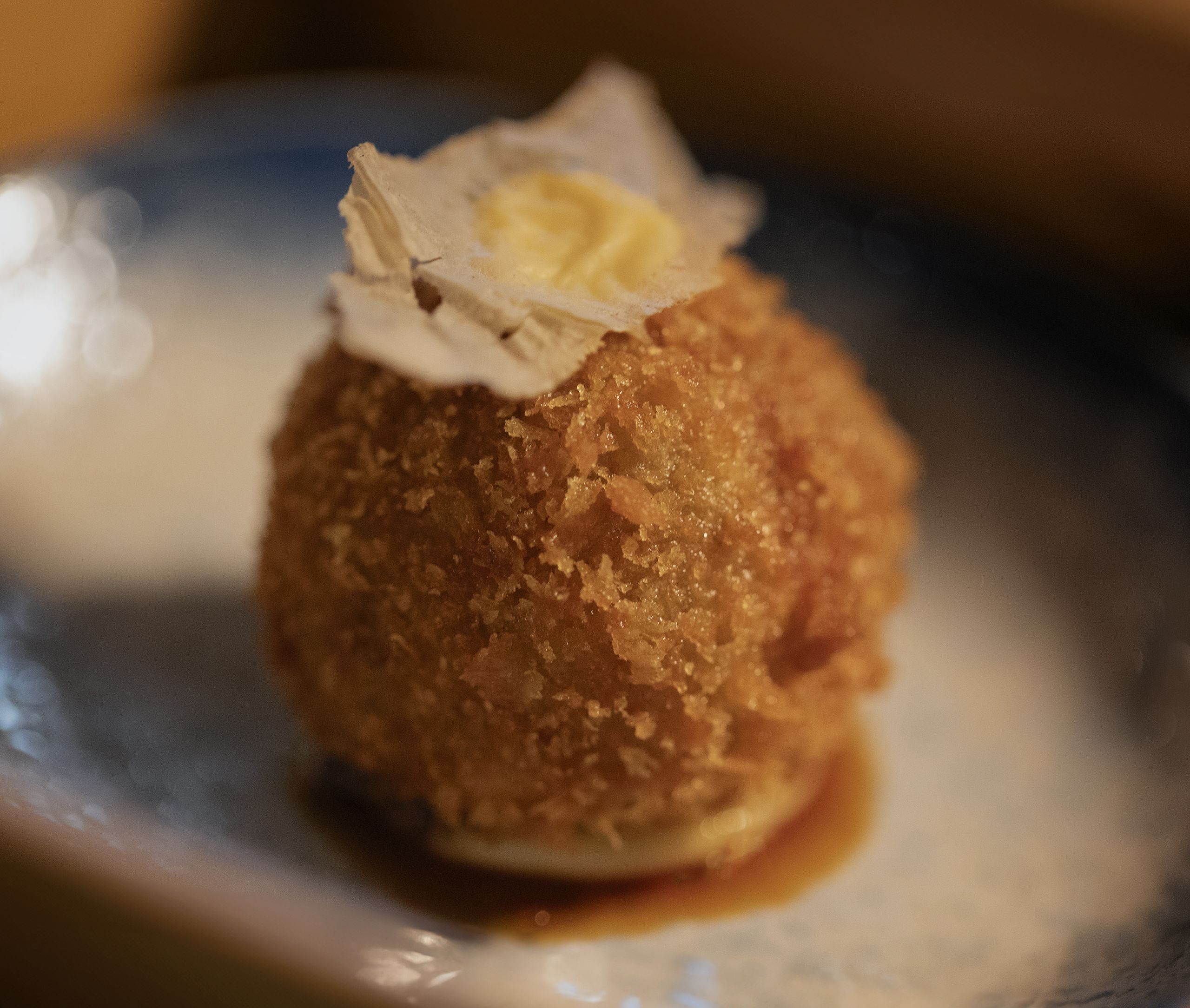 Croqueta japonesa de atún con mayonesa japonesa, tare y katsuobushi.