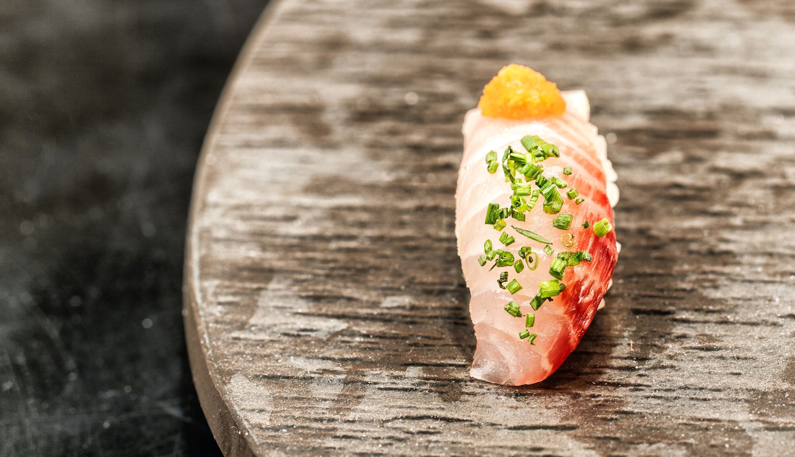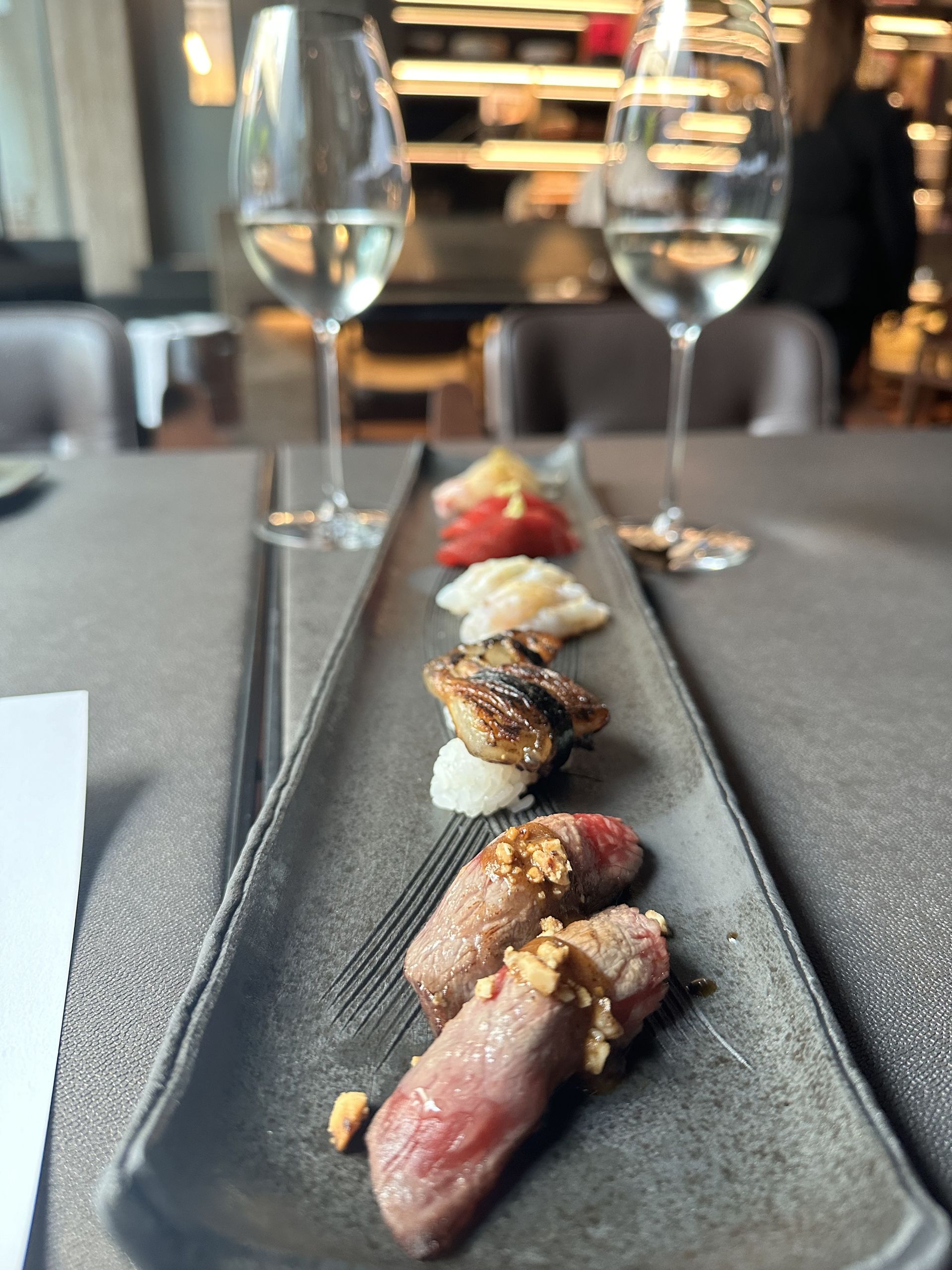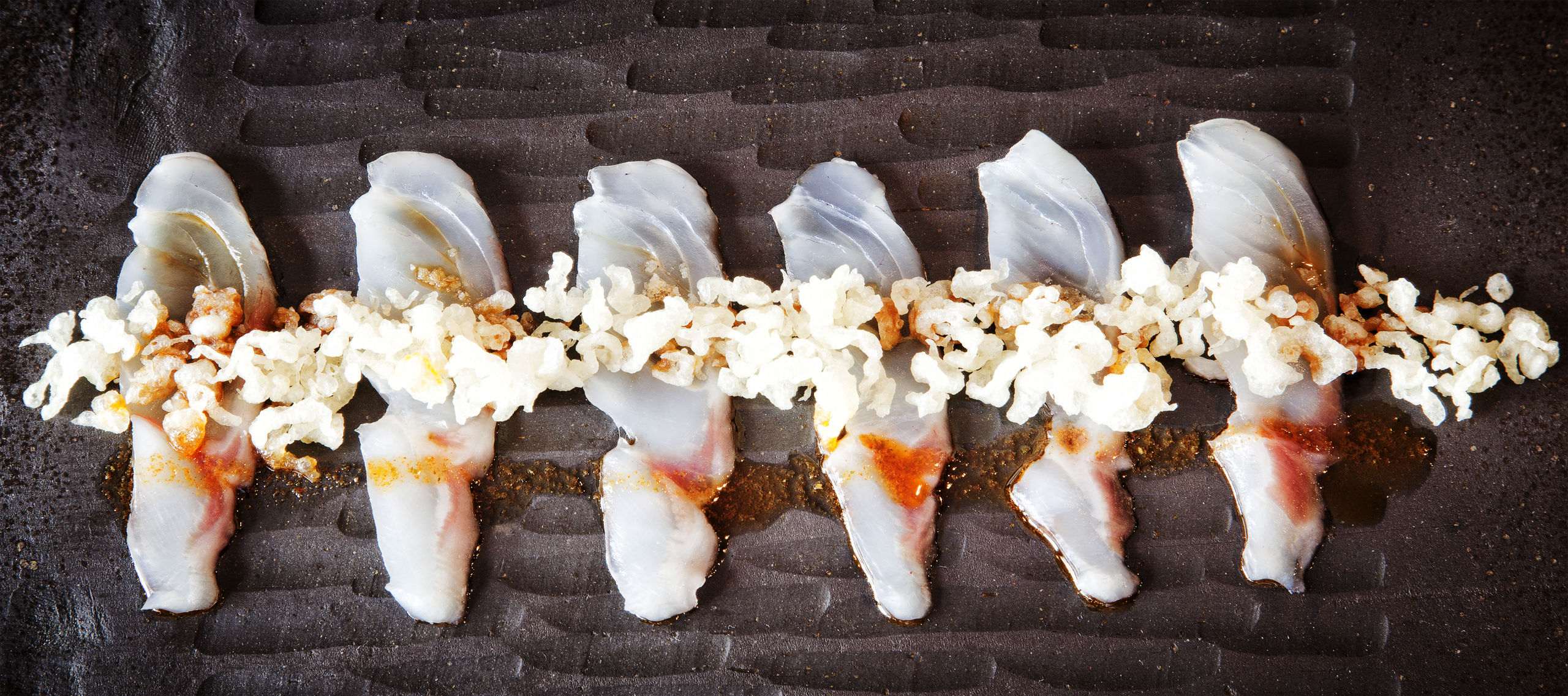 Niguiris de pescado blanco con ralladura de sudachi y yuzu kosho; de atún marinado con una gotita de wasabi; de cigala con grasa de jamón Joselito y salsa nikiri; de aleta de rodaballo marinada y terminada en robata japonesa; y de lomo bajo de vaca marinada dos días en whisky Toki, con salsa macha y unas gotas de whisky Hibiki.