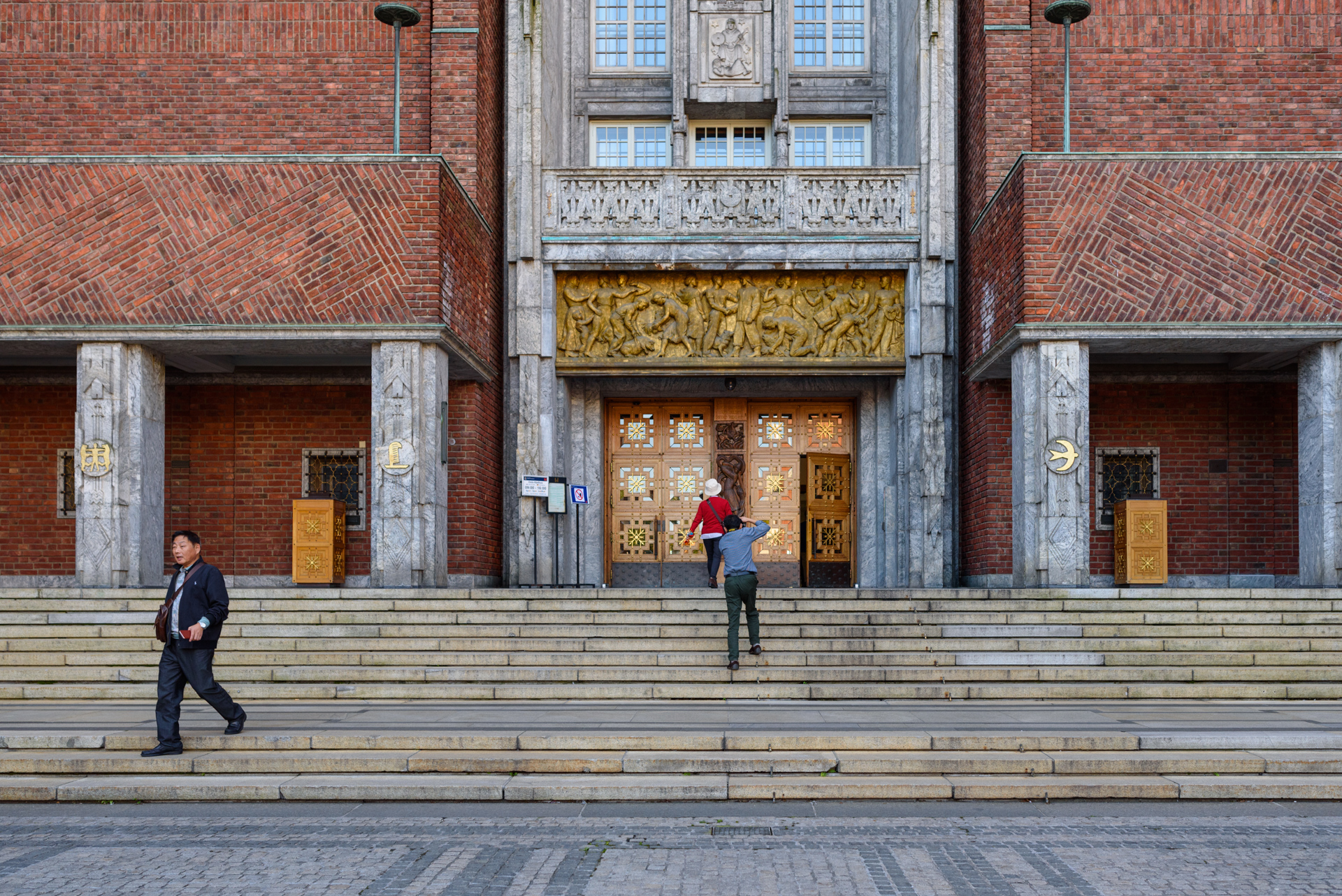 El ayuntamiento fue finalmente inaugurado el 15 de mayo de 1950, coincidiendo aproximadamente con el nonacentenario de la fundación de Oslo. En la imagen, una escultura que recuerda a la época de los prostíbulos, donde se ve a una prostituta con dos hombres. Su característica arquitectura y la celebración de la ceremonia del Premio Nobel de la Paz lo convierten en uno de los edificios más emblemáticos de la ciudad y también de los más visitados.