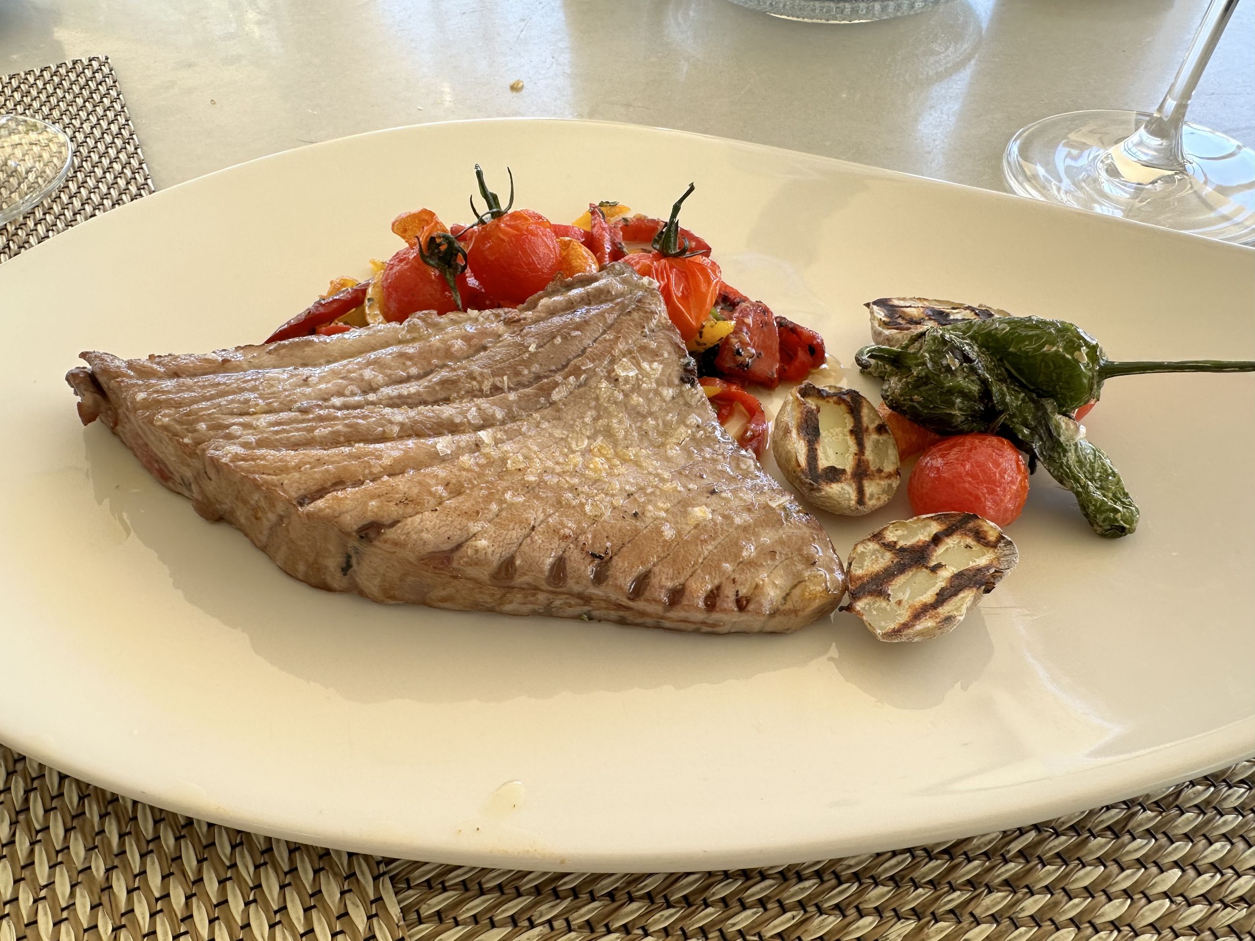 Lomo de atún con asado de pimientos y tomatillos de temporada.