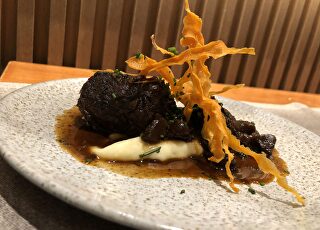 Muy buenas también las albóndigas de conejo (16,50€) en salsa de verduras a la brasa y amontillado para recordar esos sabores tan característicos del sur. Y acabamos el festival con una estupenda costilla de ternera laqueada al Pedro Ximénez (22€) lo acompañan con una crema de zanahoria. Para dejar el sabor dulce en la boca, el flan de la casa (6€) que, como dicen, es aparentemente sencillo, pero por el resultado no lo ha debido de ser tanto, cremoso y muy bueno. Y lo regamos con un fantástico PX de Ximénez-Spínola.