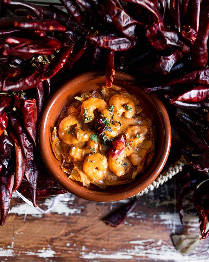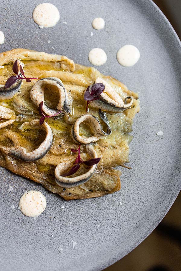 Con un Fino Perdido de las bódegas Romate en la copa, disfrutamos de ese picoteo con una ensaladilla de gambas (12€) y una tabla a modo de desgutación con un chicharrón de Chiclana con limón y sal (M 7,90€ / E 15€), un productazo que elaboran ellos mismos y que son los mejores que he comido últimamente. Si quieres viajar al sur desde tu paladar, con este plato tienes el billete asegurado. También muy buena y de elaboración propia la pesa ibérica especiada (M 8,50€ / E 16€) cocinada con la propia grasa del jamón y desde ‘Cai’ llega la rica mojama de Barbate (M 8€ / E 15€) con aceite y almendritas. Sin duda que para enmarcar la berenjena cocinada en brasas y boquerones (9,50€) que también los han elaborado ellos y los han curado en agua de tomate y vinagre de Jerez.