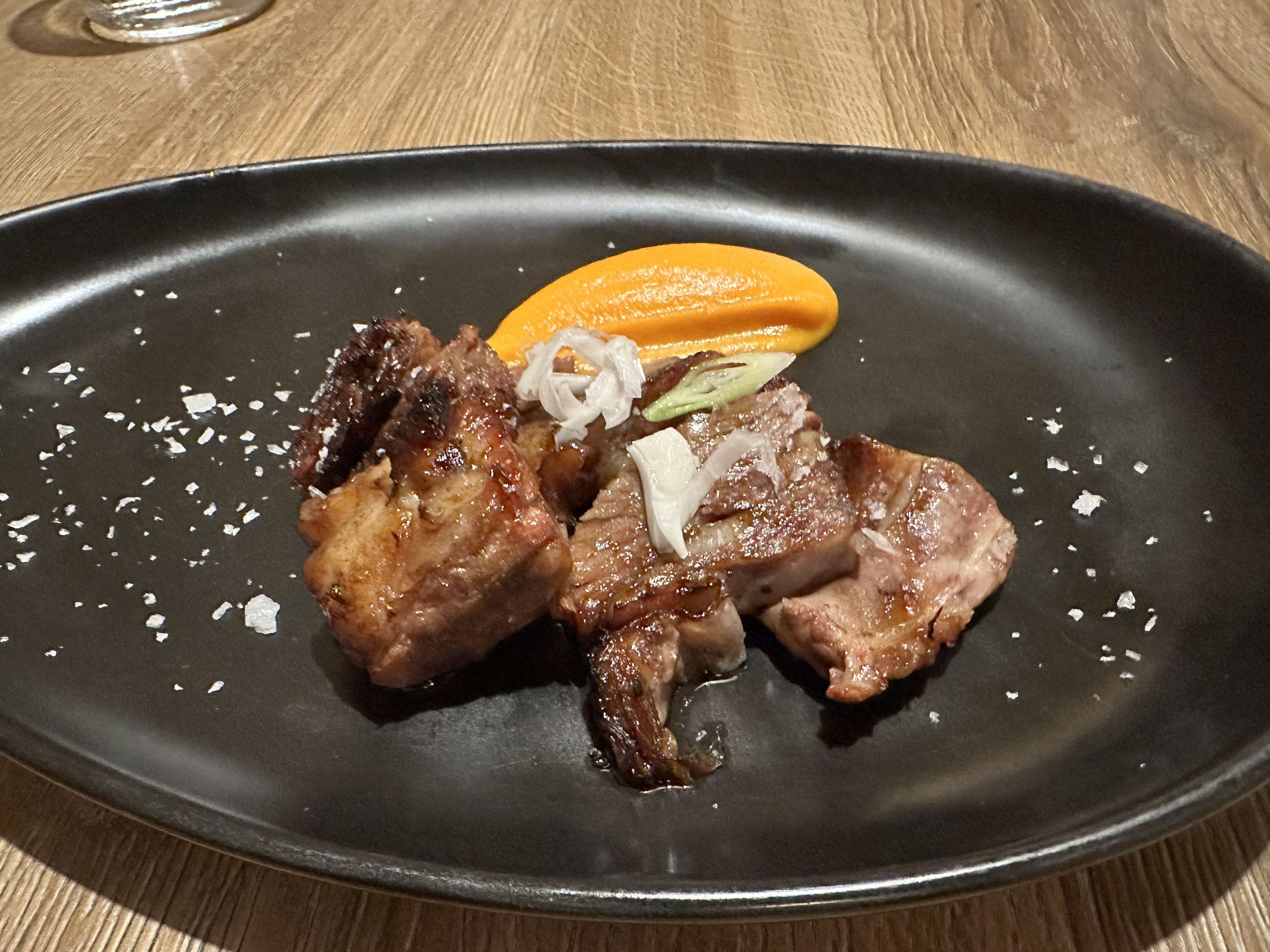Muy buenas también las albóndigas de conejo (16,50€) en salsa de verduras a la brasa y amontillado para recordar esos sabores tan característicos del sur. Y acabamos el festival con una estupenda costilla de ternera laqueada al Pedro Ximénez (22€) lo acompañan con una crema de zanahoria. Para dejar el sabor dulce en la boca, el flan de la casa (6€) que, como dicen, es aparentemente sencillo, pero por el resultado no lo ha debido de ser tanto, cremoso y muy bueno. Y lo regamos con un fantástico PX de Ximénez-Spínola.