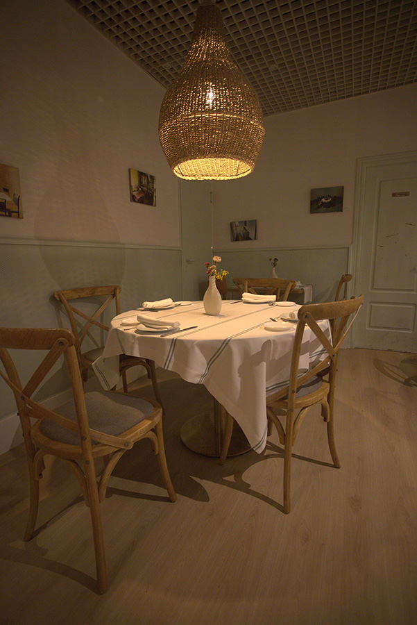 Una de las mesas de Menudeo, revestida con mantel blanco de tela.