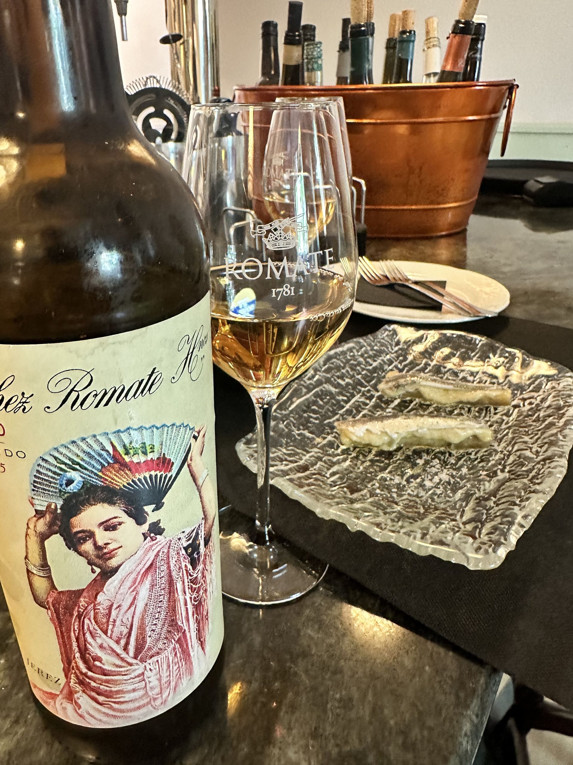 Para enmarcar la berenjena cocinada en brasas y boquerones que también los han elaborado ellos y los han curado en agua de tomate y vinagre de Jerez.