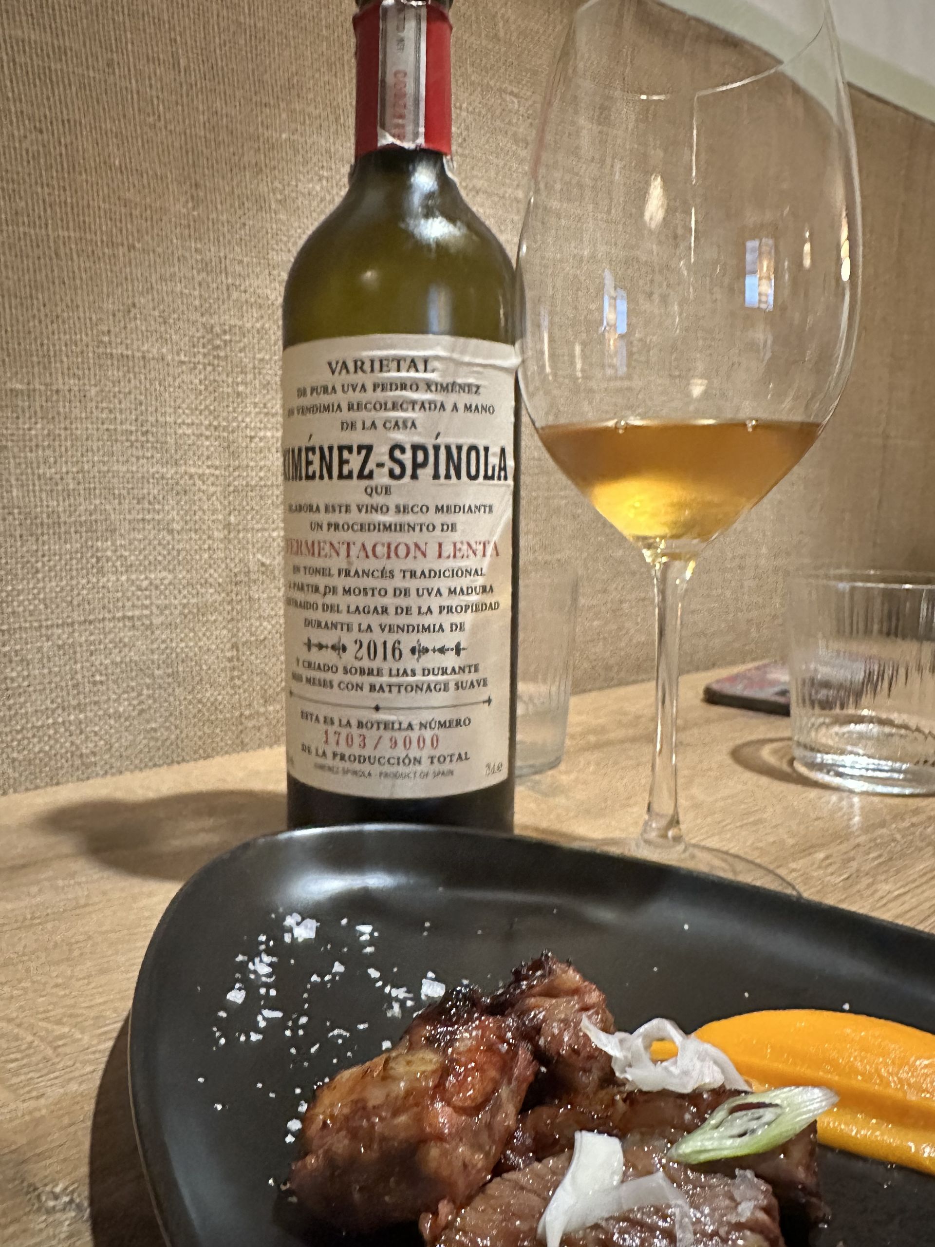 Estupenda costilla de ternera laqueada al Pedro Ximénez lo acompañan con una crema de zanahoria.