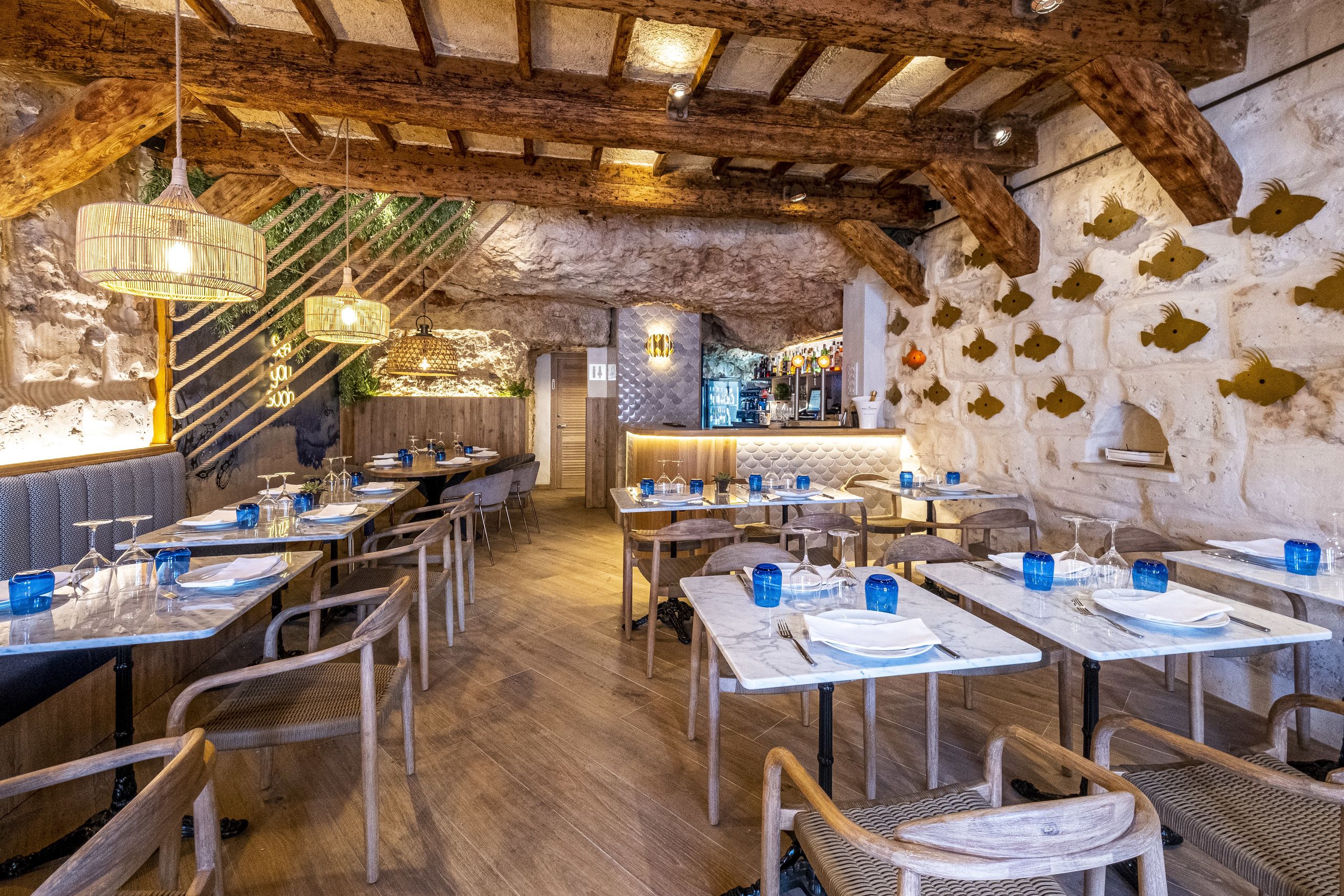 Bajo la antigua muralla medieval del muelle de Ciutadella, situada en una impresionante cueva natural, su carta, con alma puramente mediterránea, propone comenzar con una sección de curados, crudos y marinados.