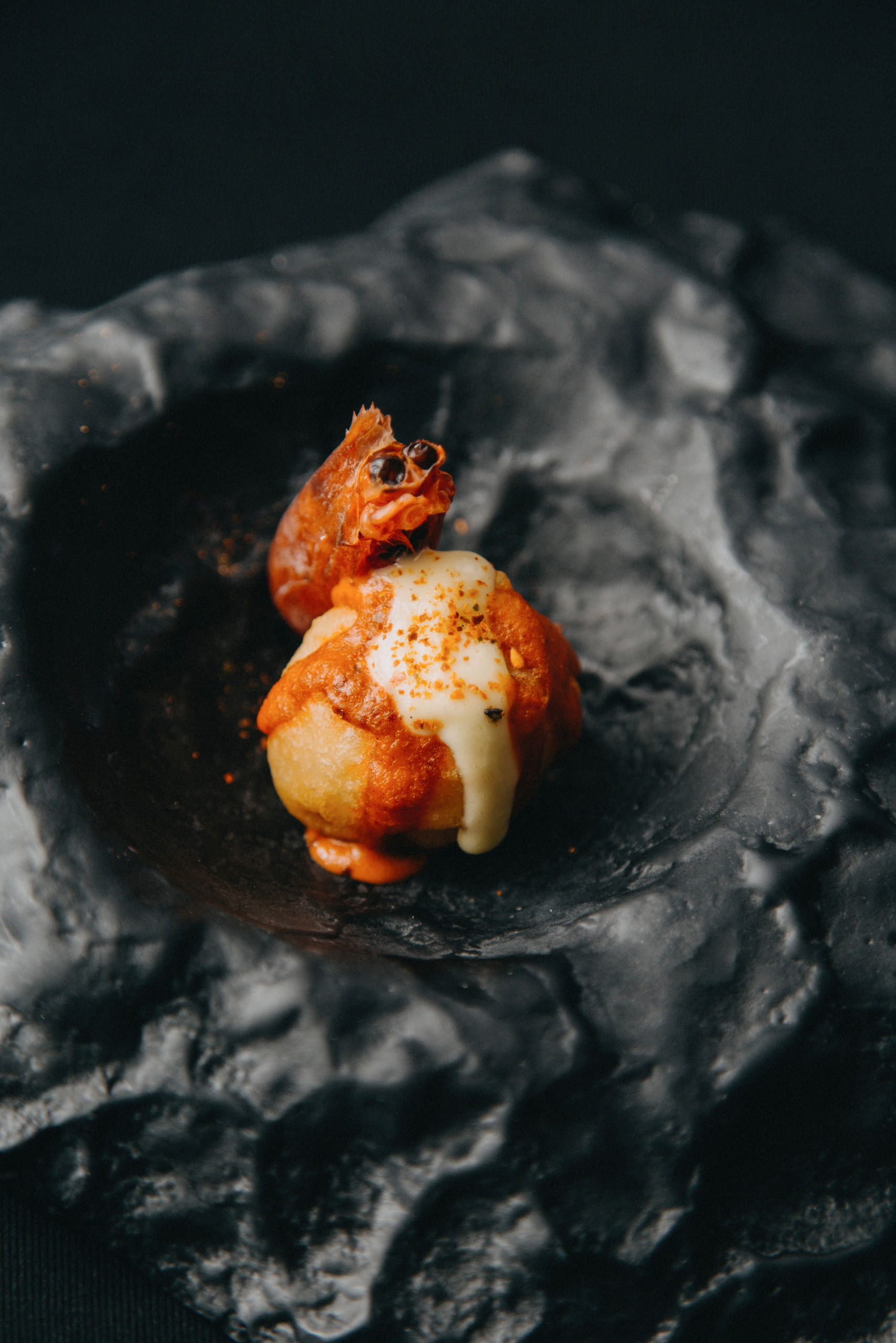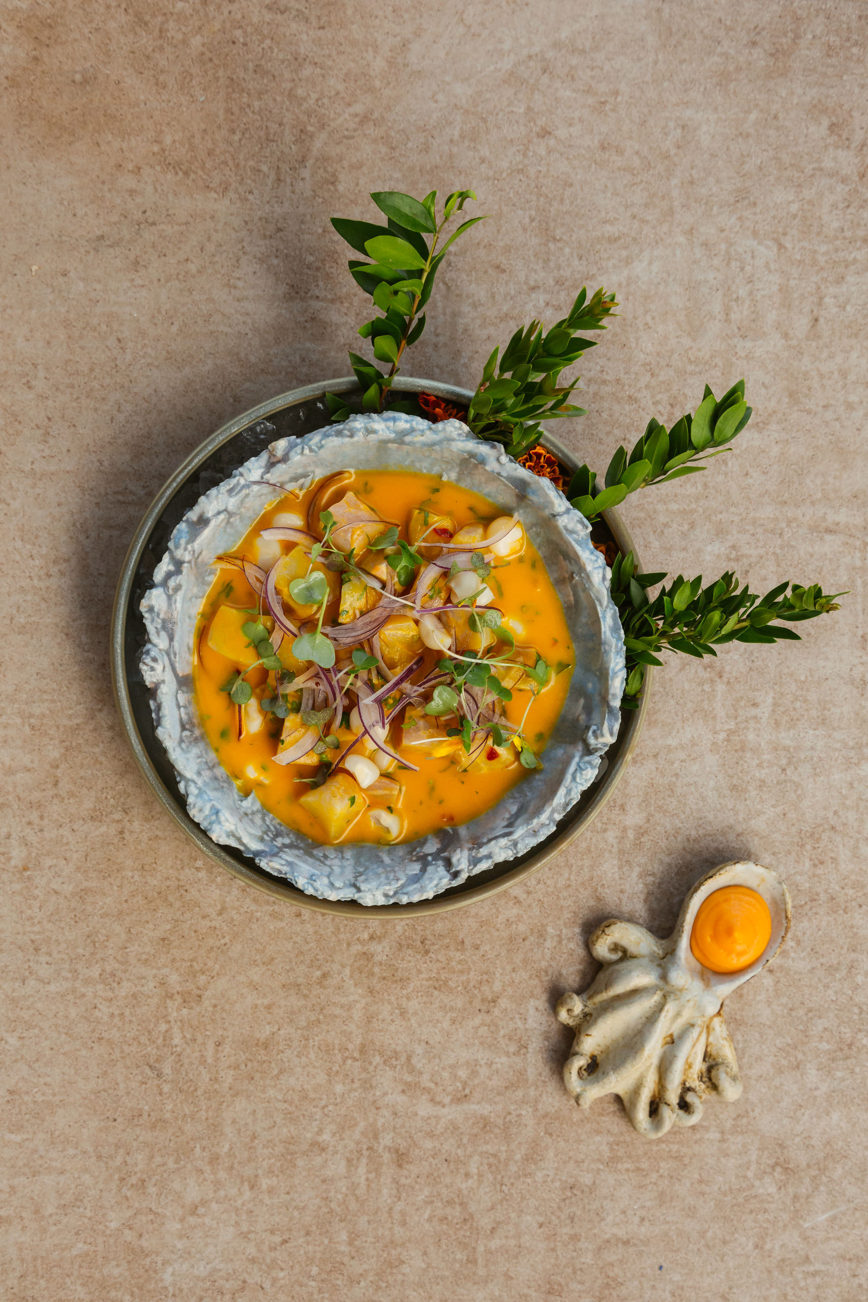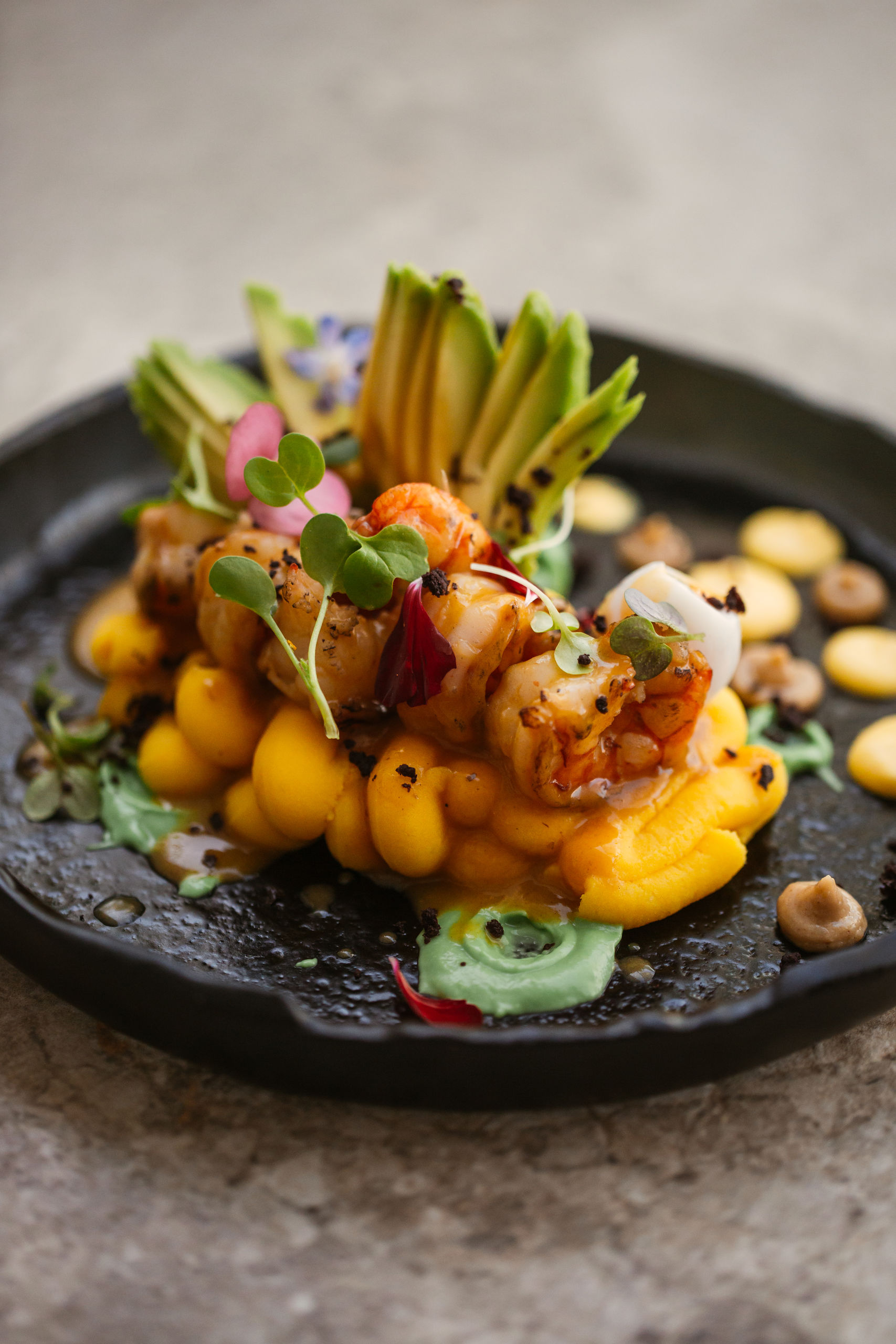 También típico de la cocina peruana es la causa limeña y Omar Malpartida la prepara con escabeche de ají amarillo, pesto, langostino al wok, tomates confitados y emulsión de erizo para darle todo el sabor a mar.