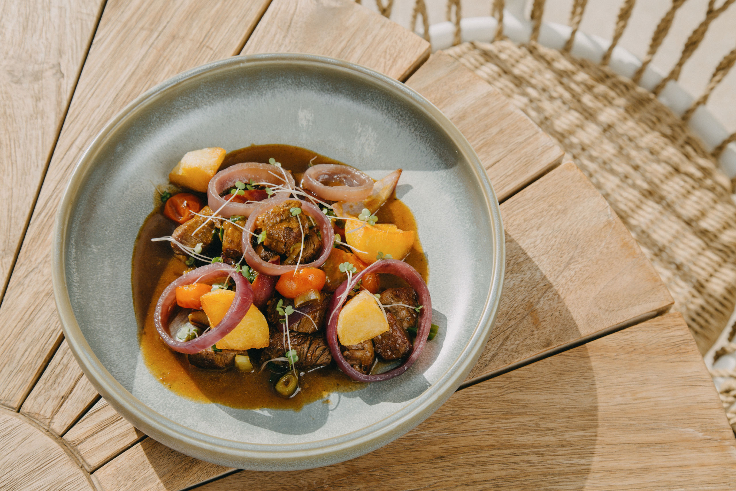 Lomo saltado con verduras del huerto y pimientos del padrón tatemados.