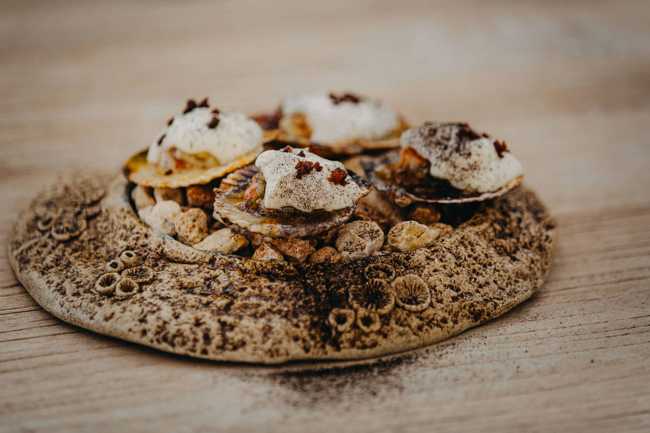 Sin duda te vas a enamorar de su zamburiña a la parmesana con mantequilla de sobrasada y ajo confitado.