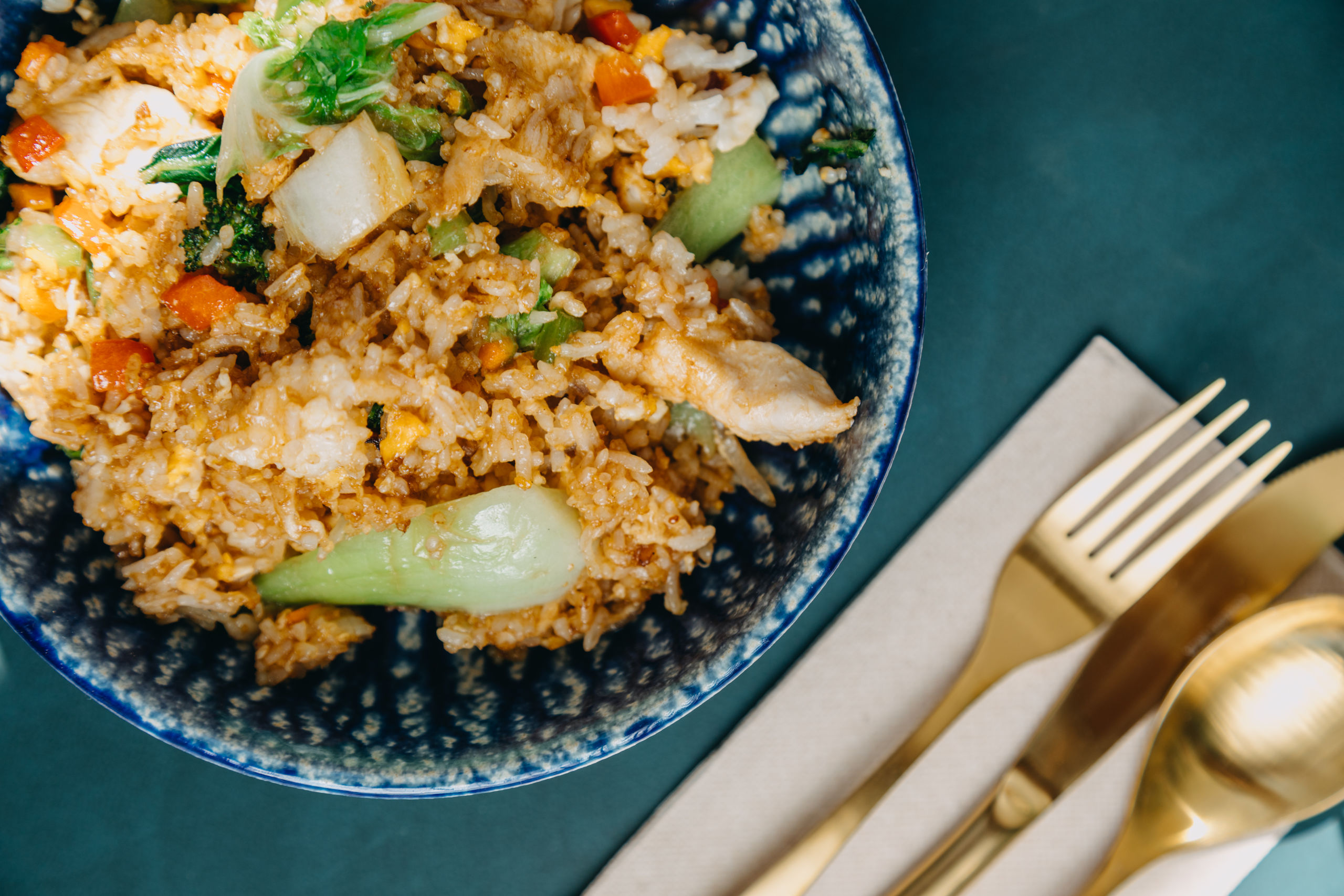 Khao Pad Khai, arroz salteado al wok con pollo, huevo y verduras al estilo tailandés.