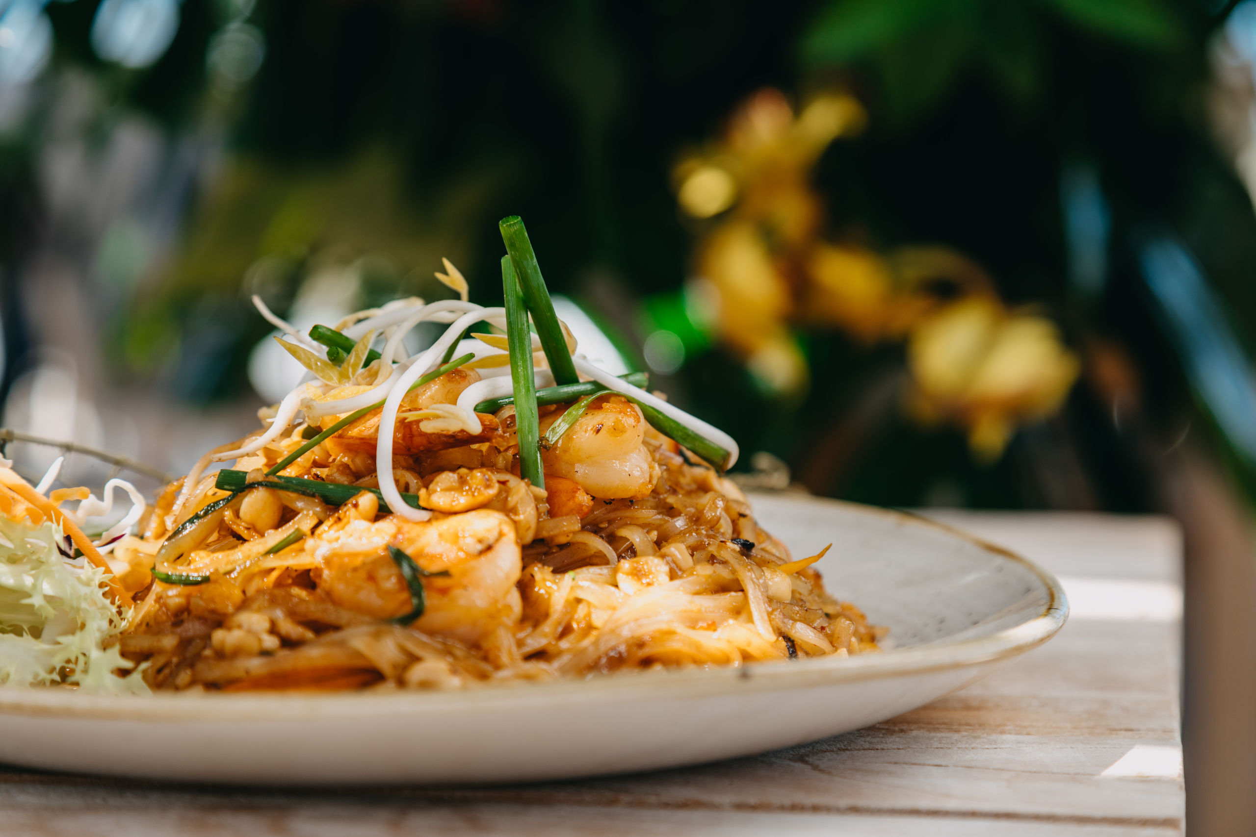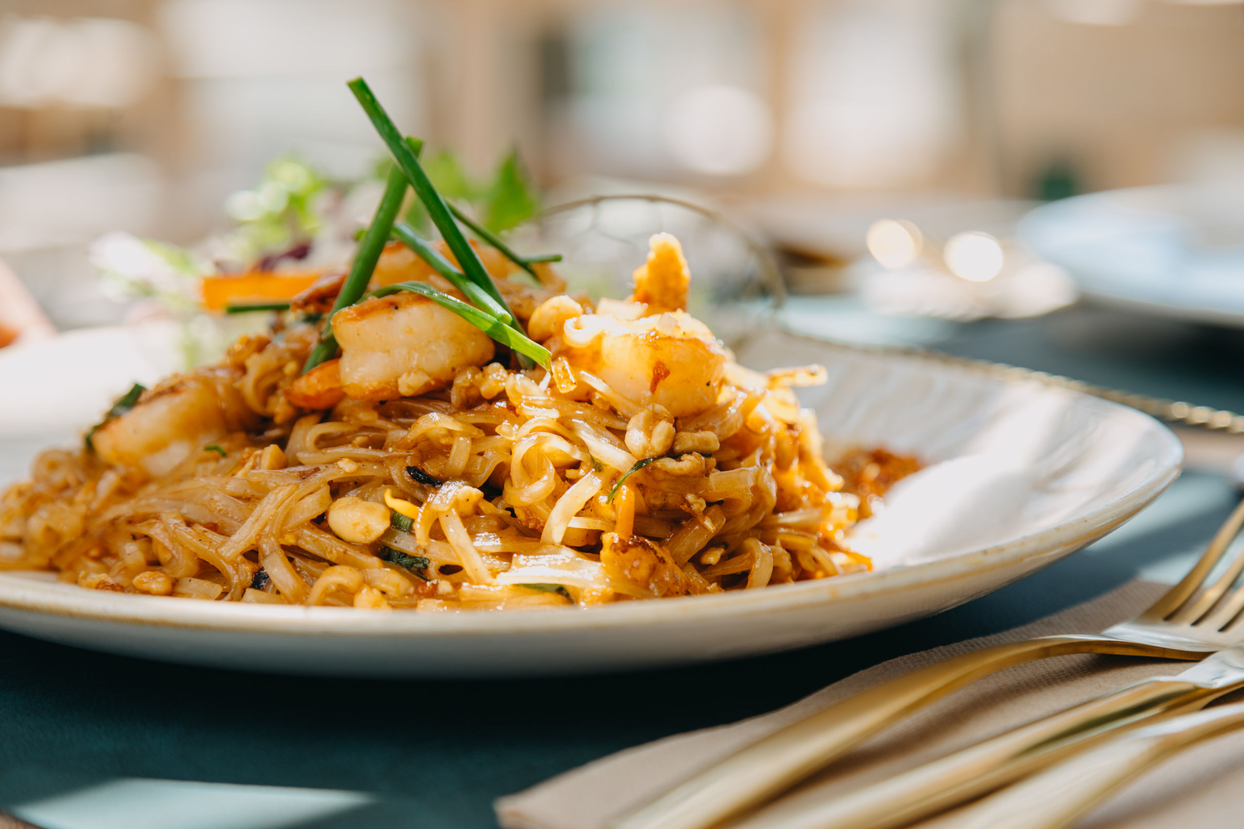 Pad Thai, tallarines salteados al wok con langostinos y verduras.