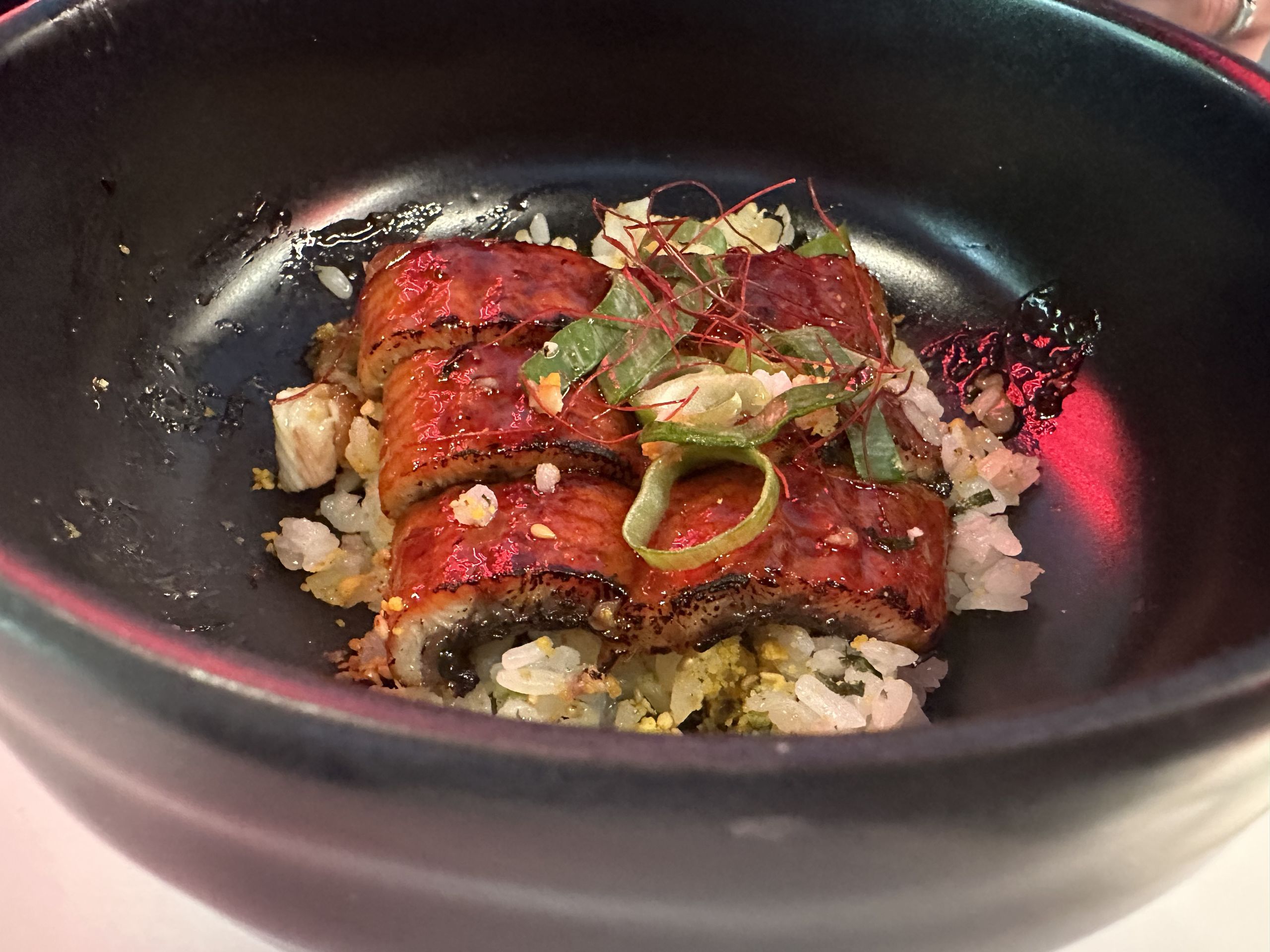 Domburi con mayonesa de ostras, un cuenco de arroz con furikake, la anguila kabayaki caramelizada con azúcar de caña a la que le añaden un toque de cebolleta e ito togarashi, una especia japonesa que se obtiene de la guindilla roja desecada.