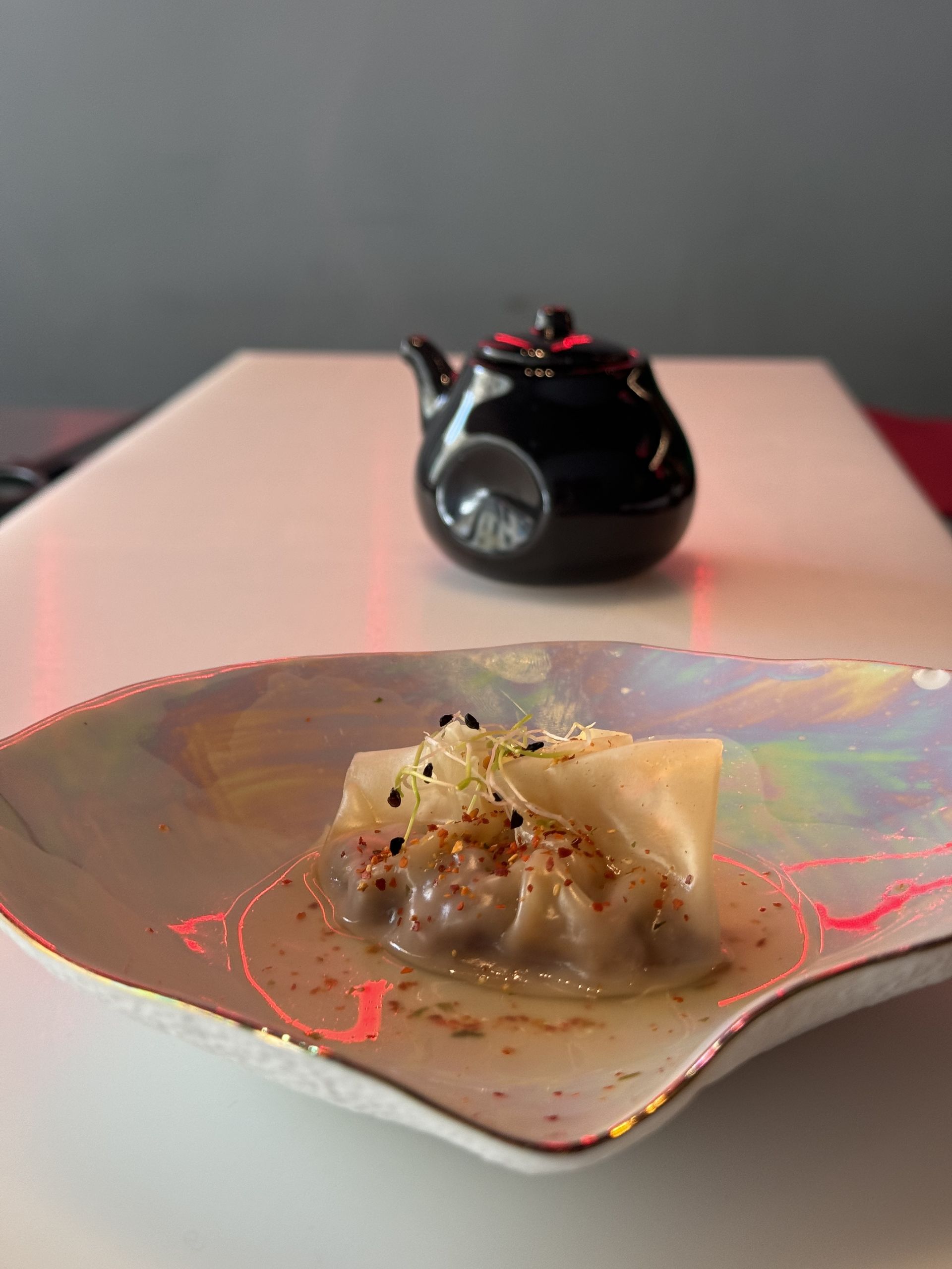 La segunda mitad del menú comienza con un pan bao de tartar de salmón marinado en aceite de albahaca con un toque de miel y mayonesa de tomate seco, germinado de rabanito y masago arare, unas perlas de arroz inflado para darle unb toque crunchy.