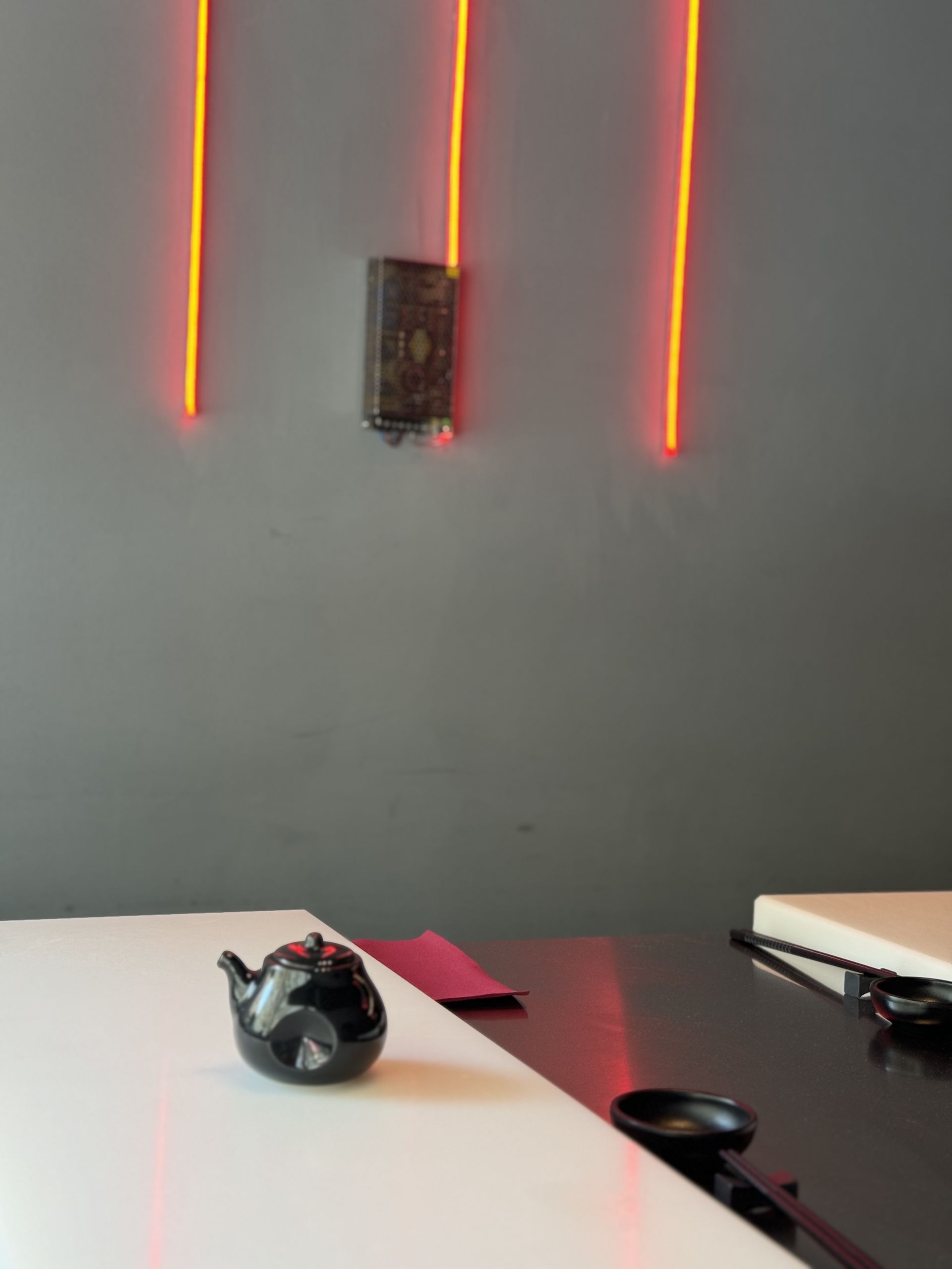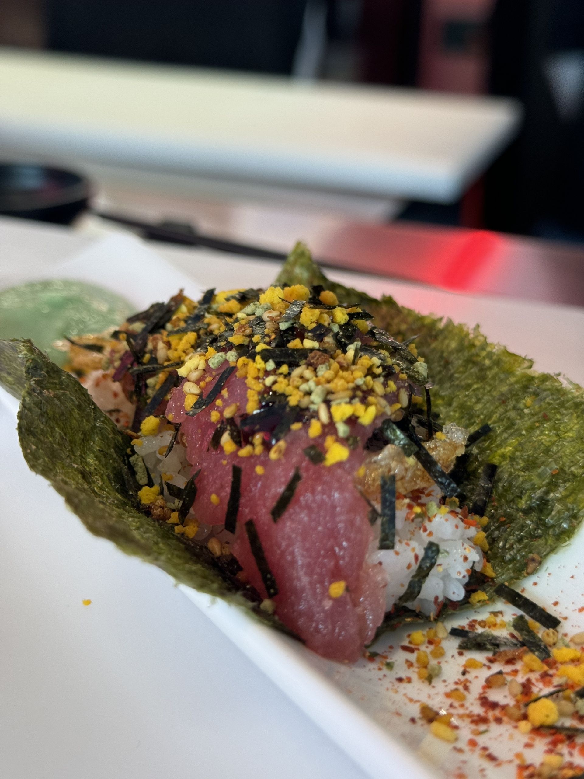 Temaki de huevo de codorniz acompañado de una cama de shichimi togarashi, condimento japonés elaborado a base de siete especias, se le añade el atún, soja dulce y un toque de furikake. En definitiva, alga, huevo y bonito disecado para comerlo como un taco mexicano en el que hay que tener cuidado cuando muerdas la yema del huevo para no mancharte.