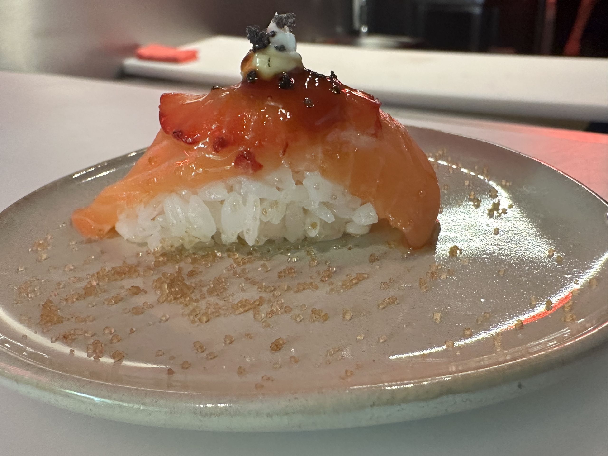 El último pase es el postre, un niguiri de salmón con carpaccio de fresa cristalizado con azúcar de caña con un toque de crema de queso y una gota de soja dulce y sal de manantial.
