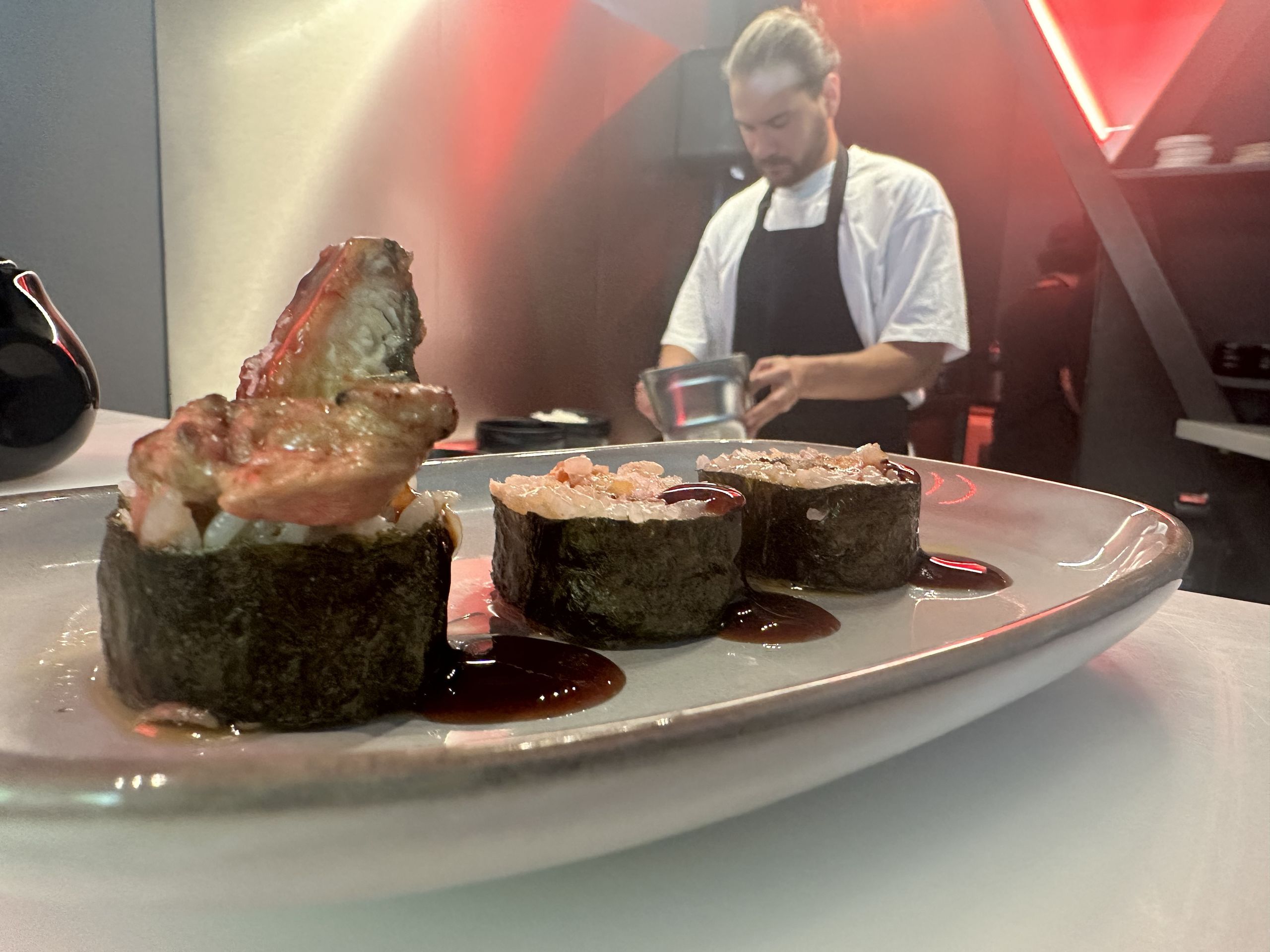 El chef prepara el siguiente pase mientras disfrutamos con el roll de anguila kabayaki con foie recién flambeado al que le añaden salsa de anguila y sal Maldon.
