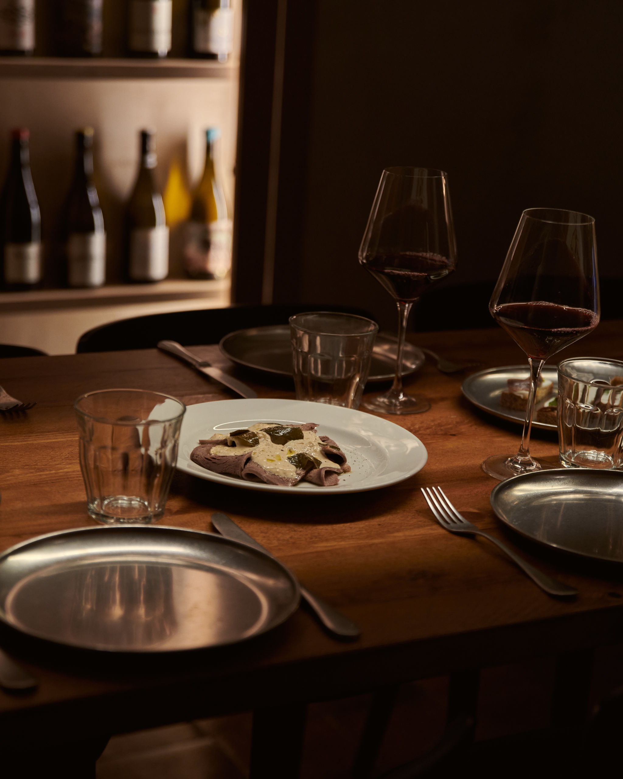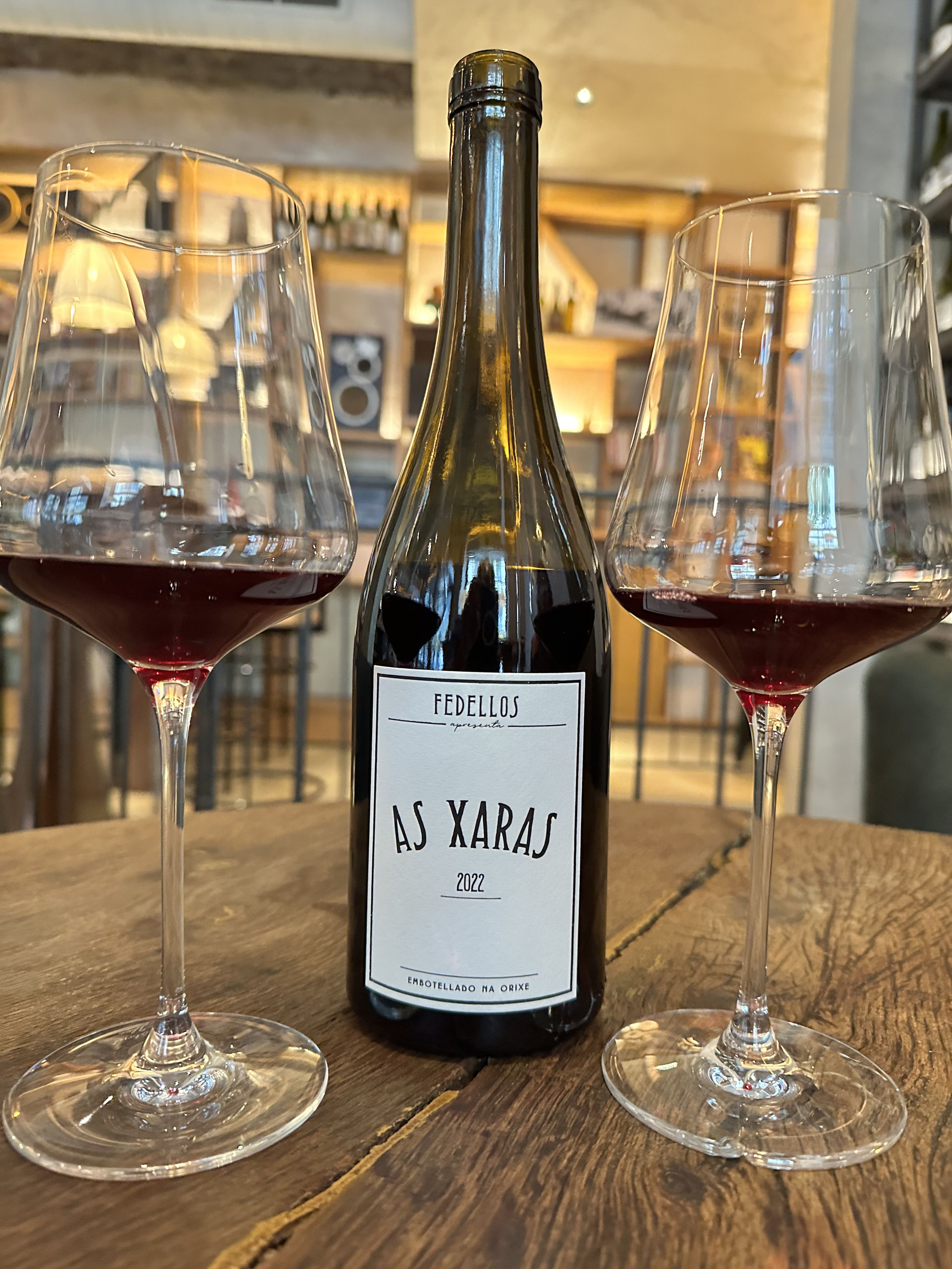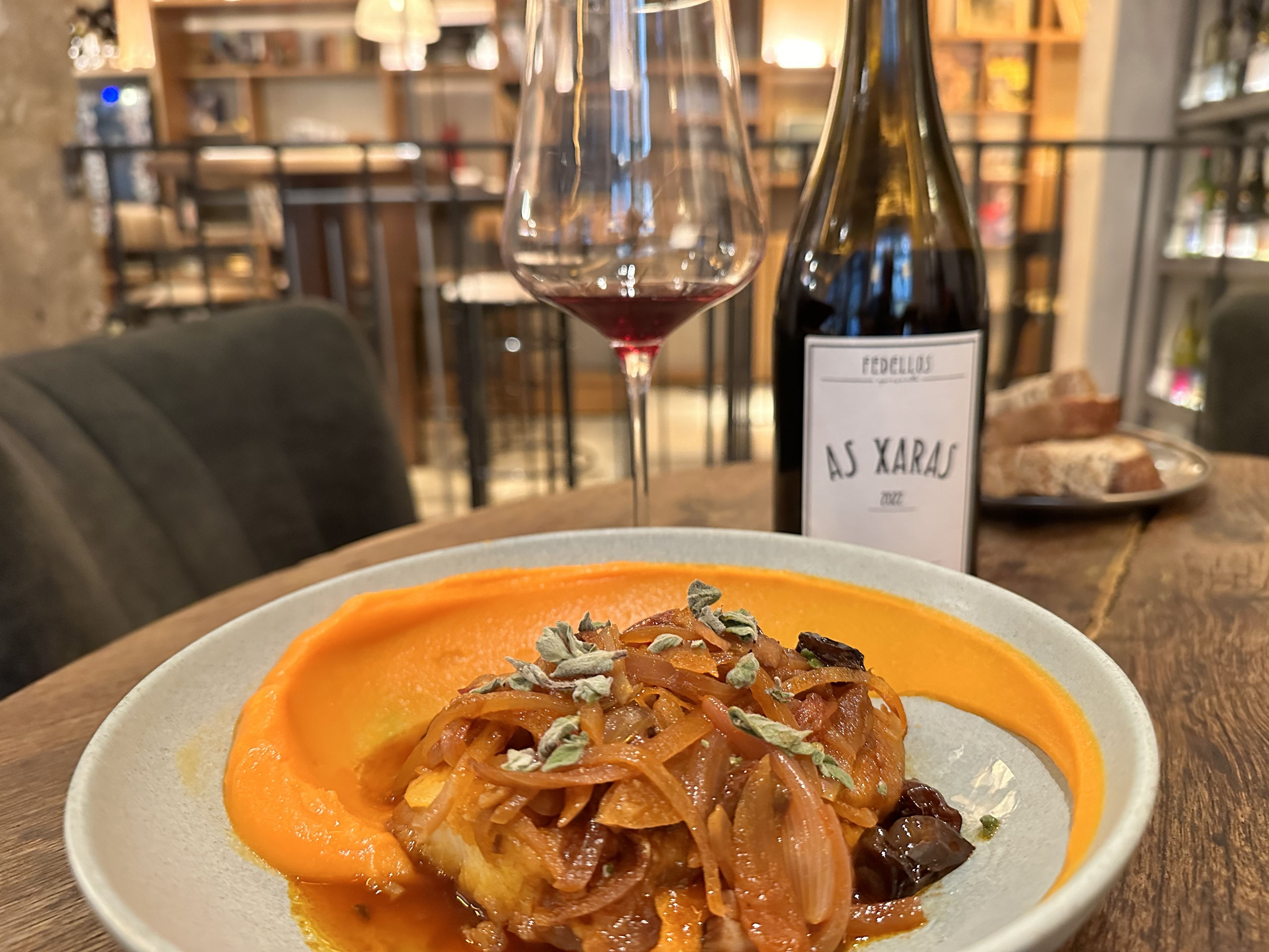 Su carta de vinos reúne aproximadamente 65 referencias y está centrada en vinos de pequeños productores, mayoritariamente naturales y biodinámicos, una muestra de su dedicación y atención al detalle, al producto y al origen. Nosotros maridamos con un buen vino tinto As Xaras de la bodega Fedellos de Couto, 100% Mencía y con DO Ribeira Sacra.