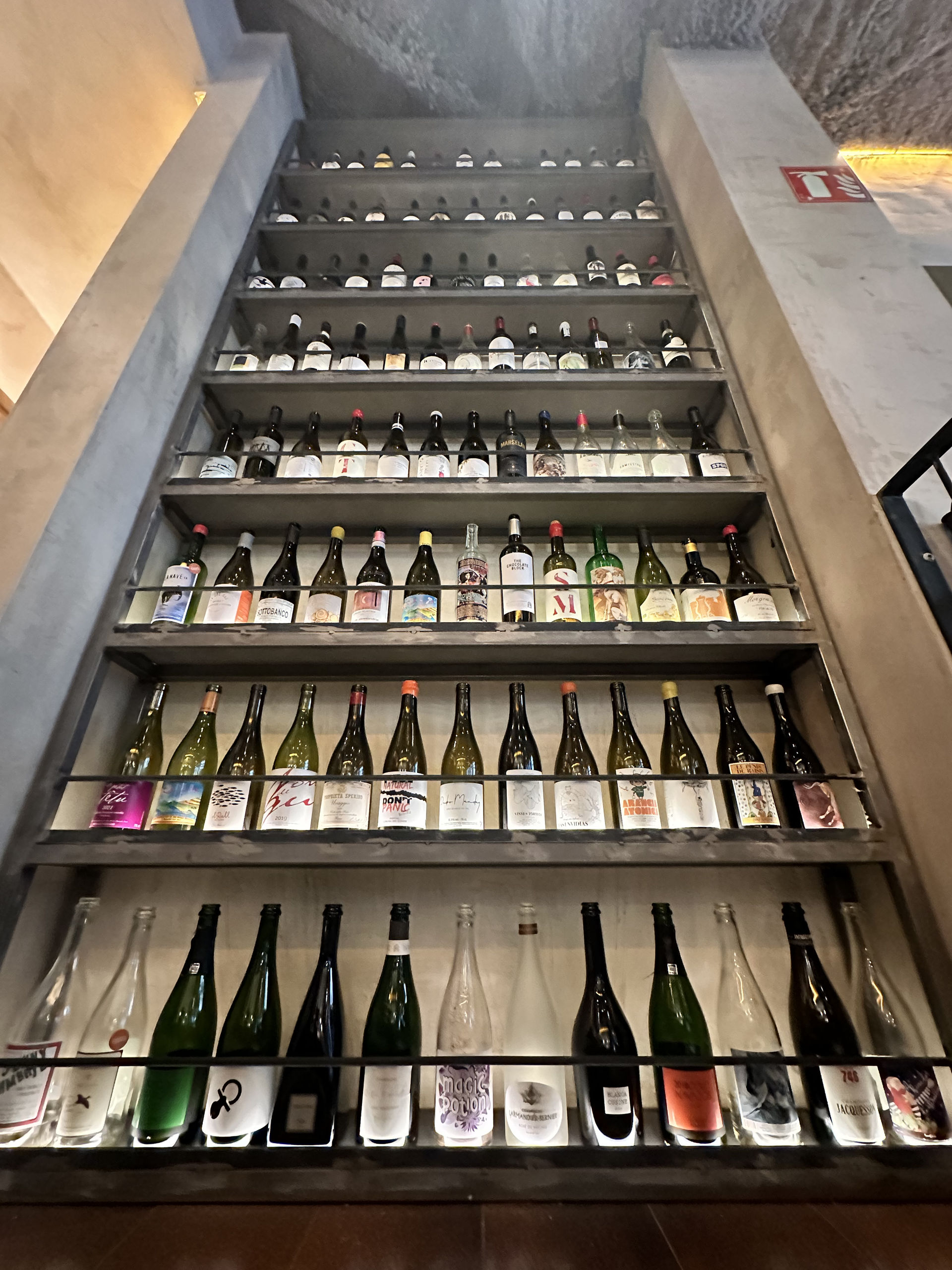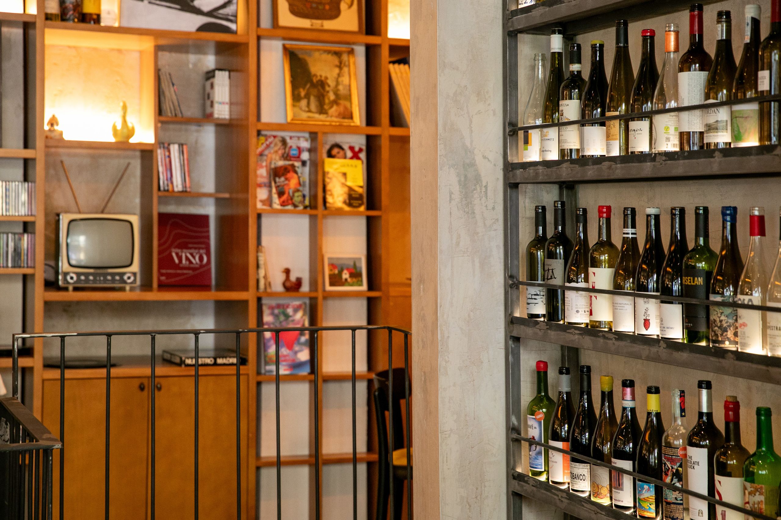 La estantería que da acceso a la planta baja está repleta de botellas de vino.
