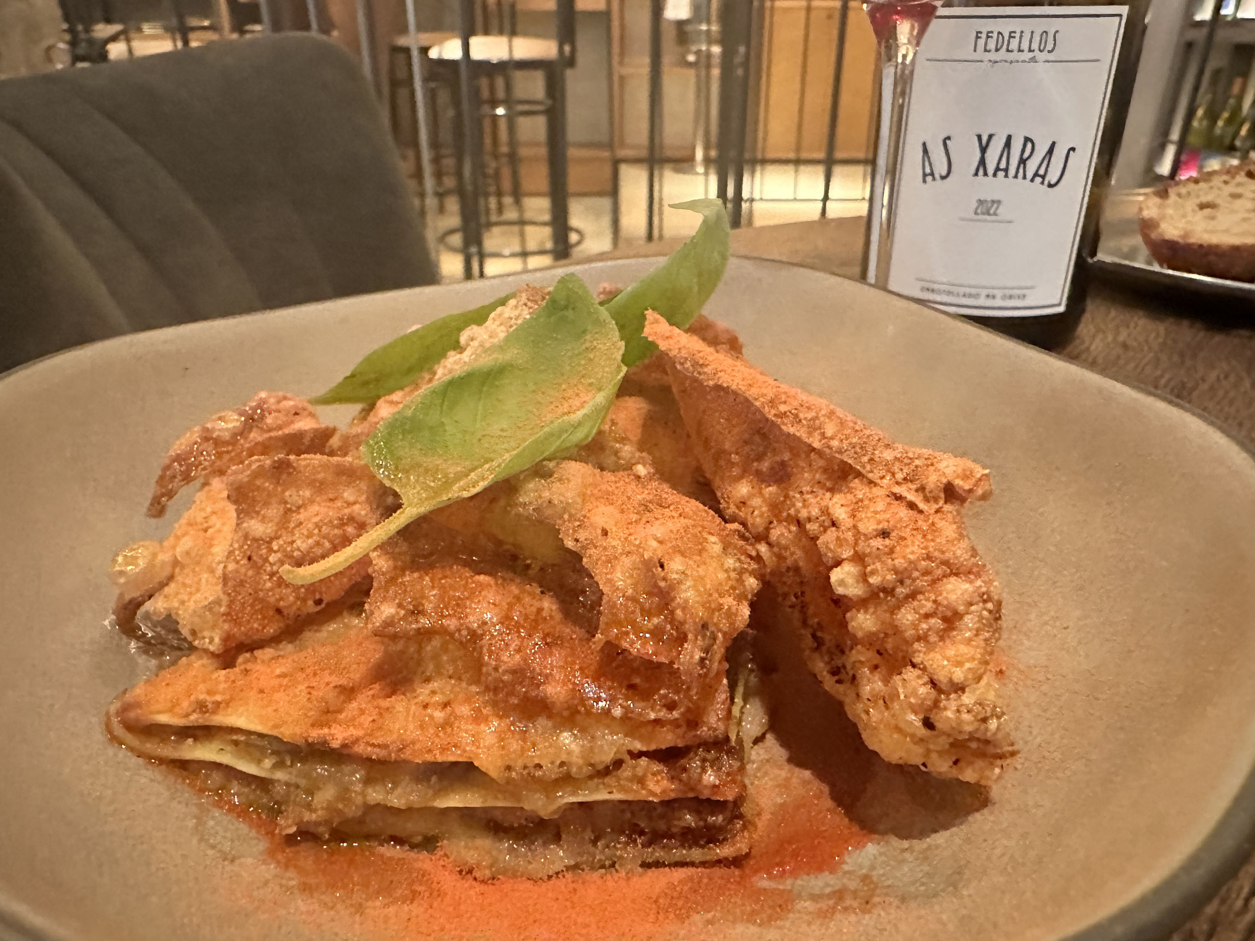 Lasaña de cochinillo asado a baja temperatura, con bechamel de ibérico y su piel crujiente.