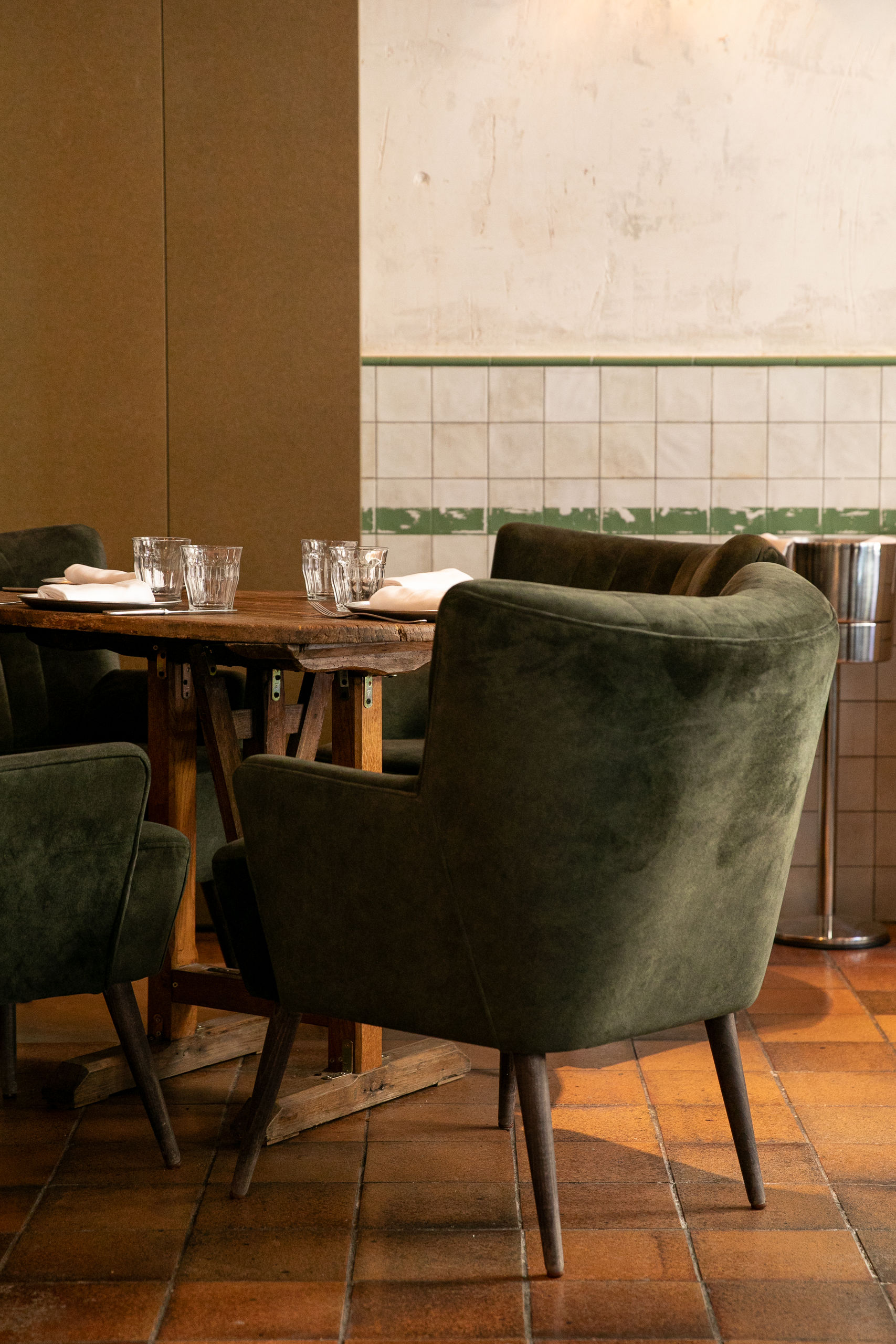 Las mesas de madera y las butacas aterciopeladas se funden con sus estructuras de hormigón y ventanales de hierro.