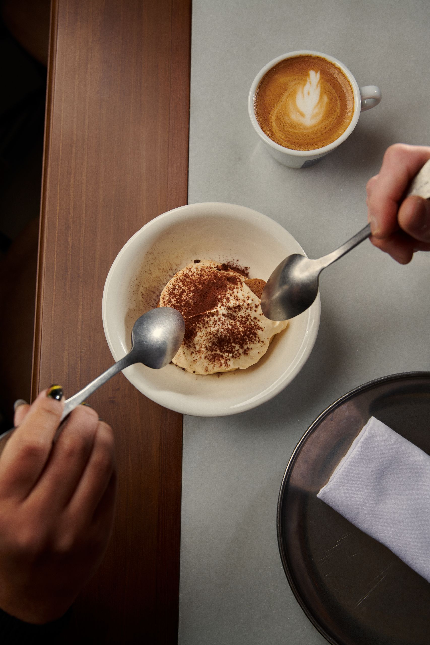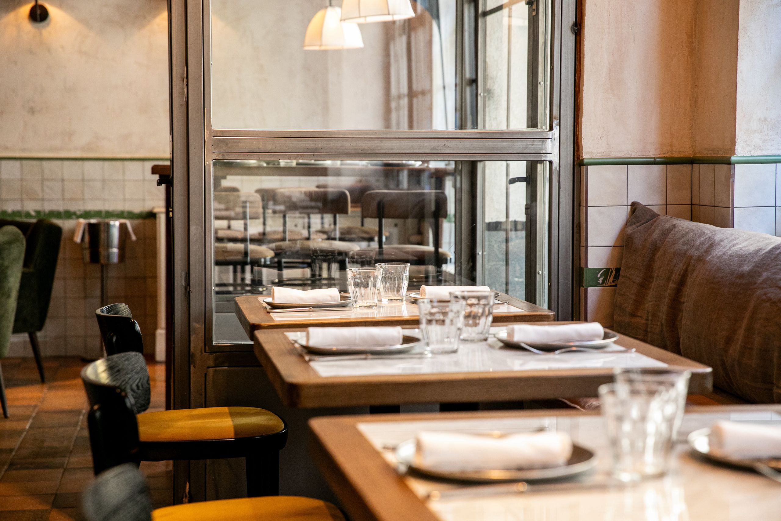 Mesas altas y bajas se mezclan en el salón principal, además de una barra en la que puedes comer contemplando la cocina abierta.