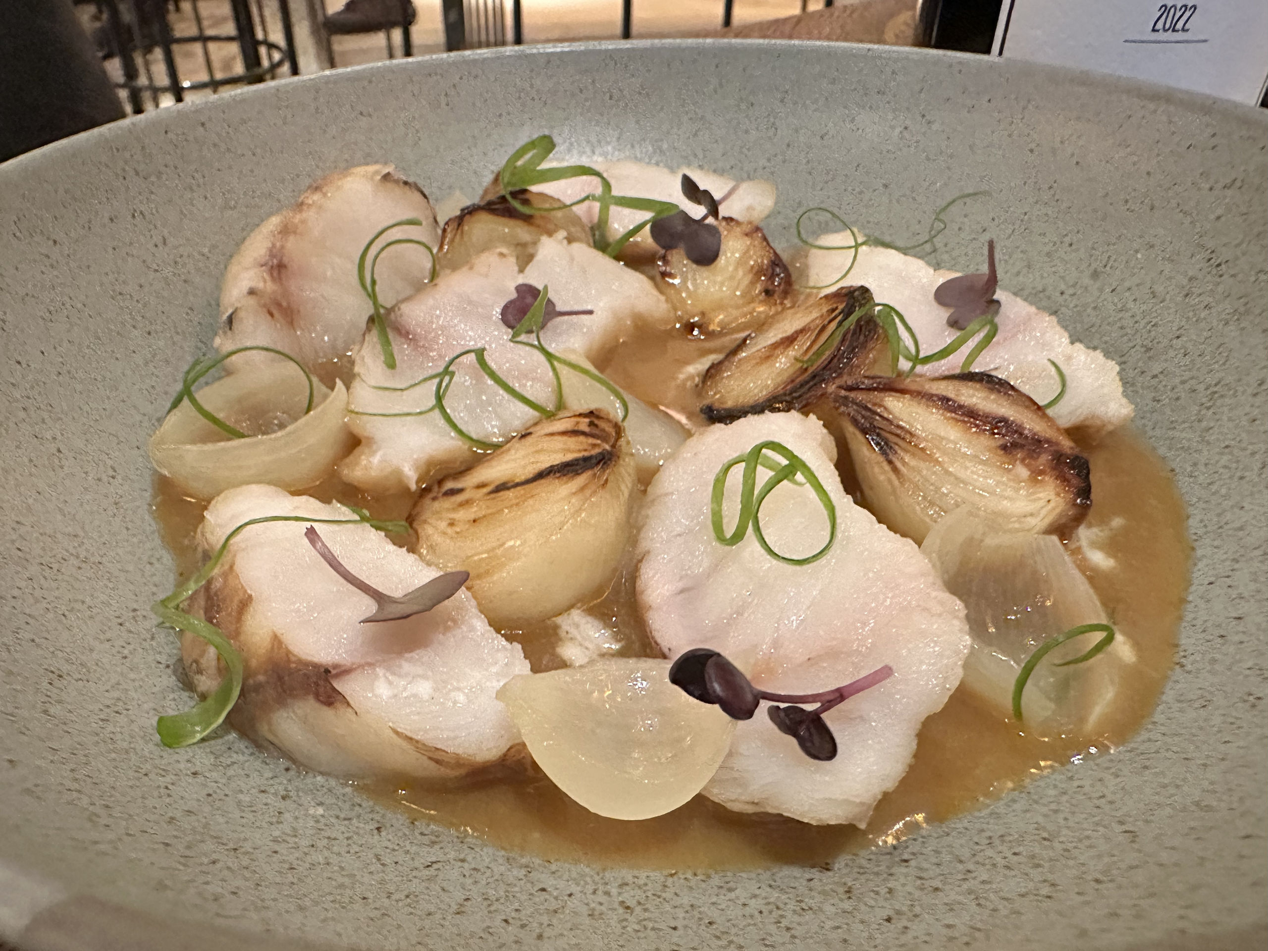 Fantástico rape con fumé del propio pescado, tuétano, azafrán y cebolletas asadas.