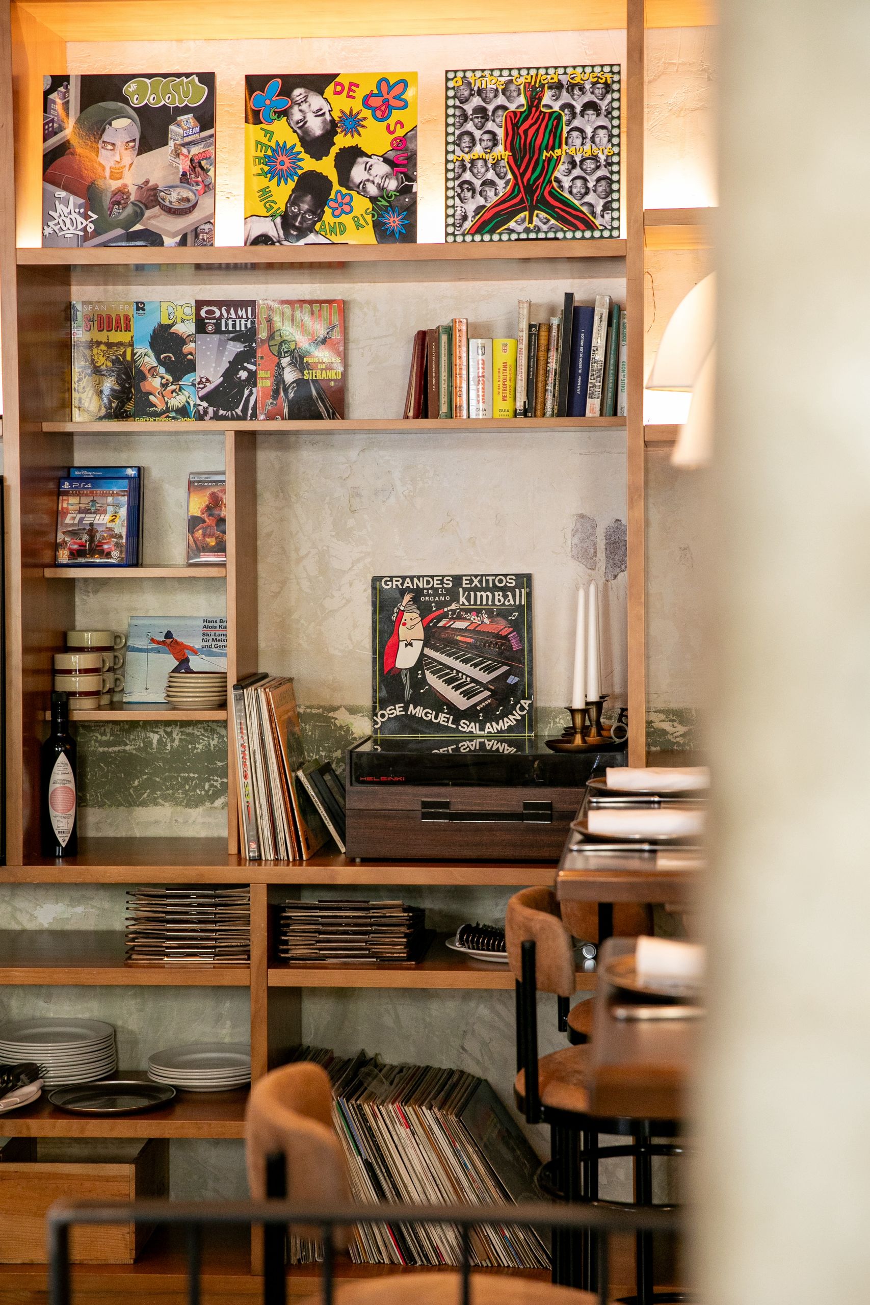 No pasa desapercibida su emblemática estantería de madera decorada con objetos antiguos como vinilos, libros y juegos de mesa, que transmiten a la perfección la esencia del restaurante.