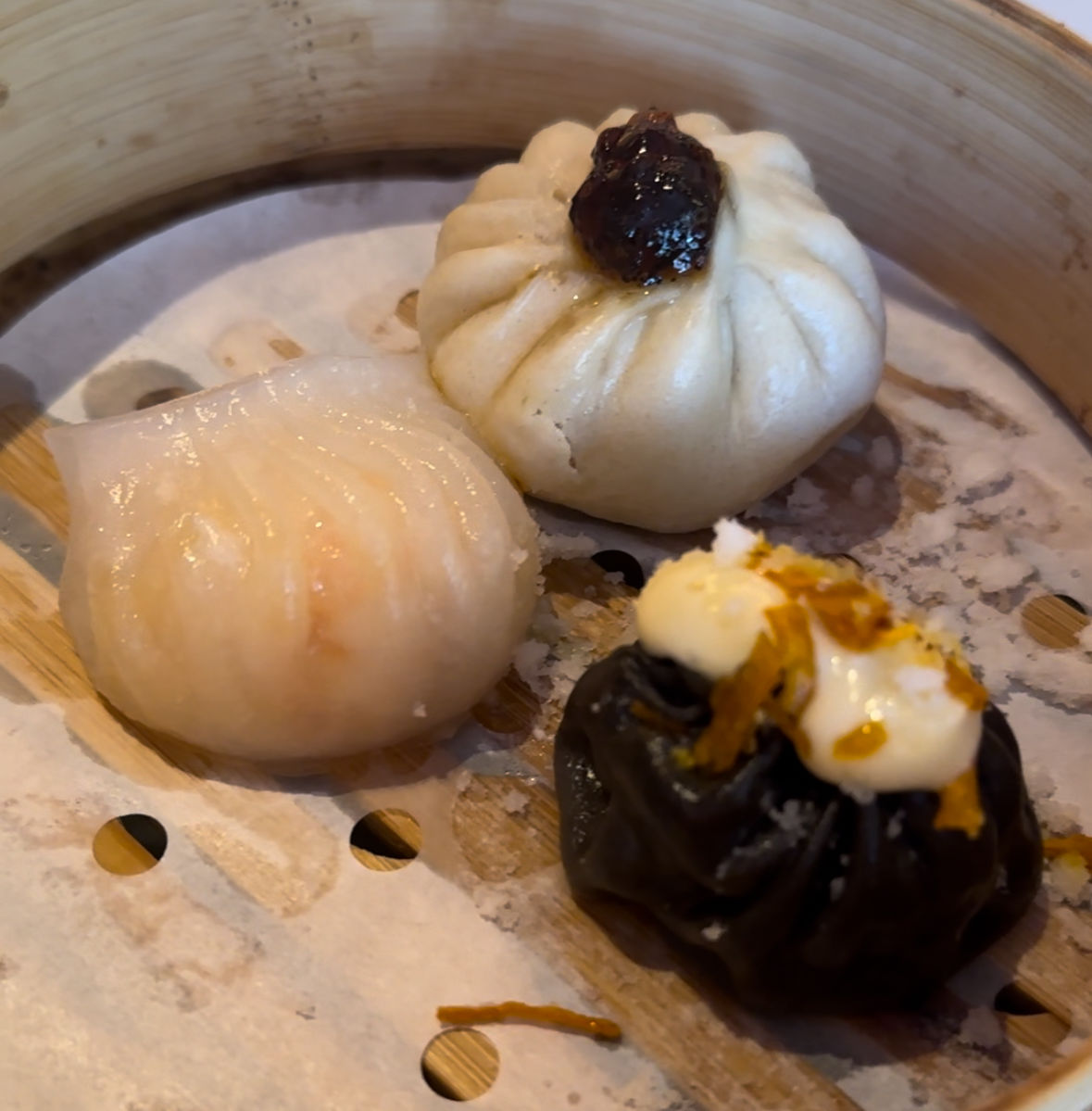 A continuación llegan tres deliciosos bocados, a cada cual mejor de hakao de langostino y jengibre, xiao long bao de calamar y marisco y xiao long bao Shanghai Mama con trufa negra, para mí el mejor de los tres.