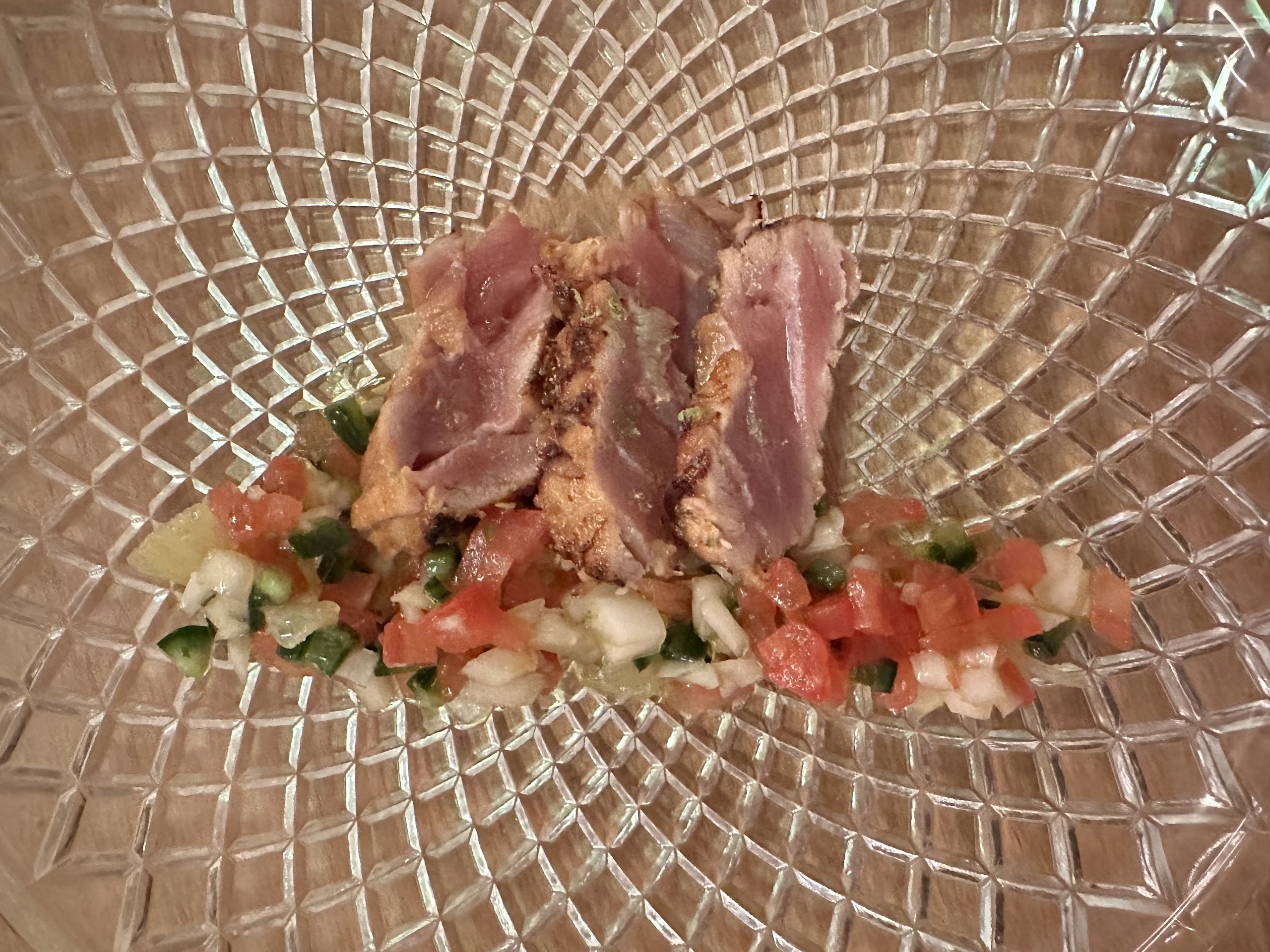 Tarantelo de atún rojo a la brasa con picada de tomate, lima, albahaca y chiles.