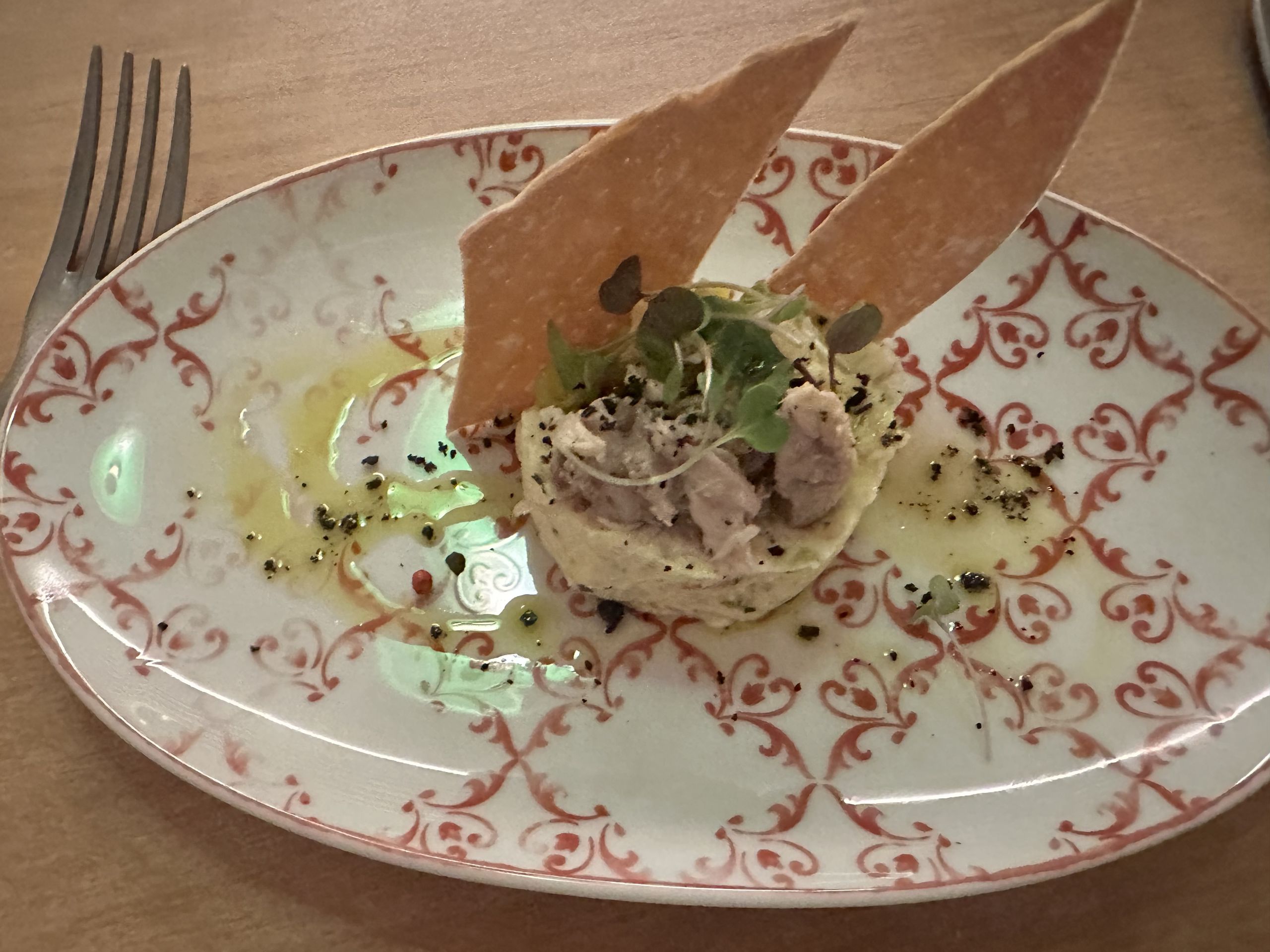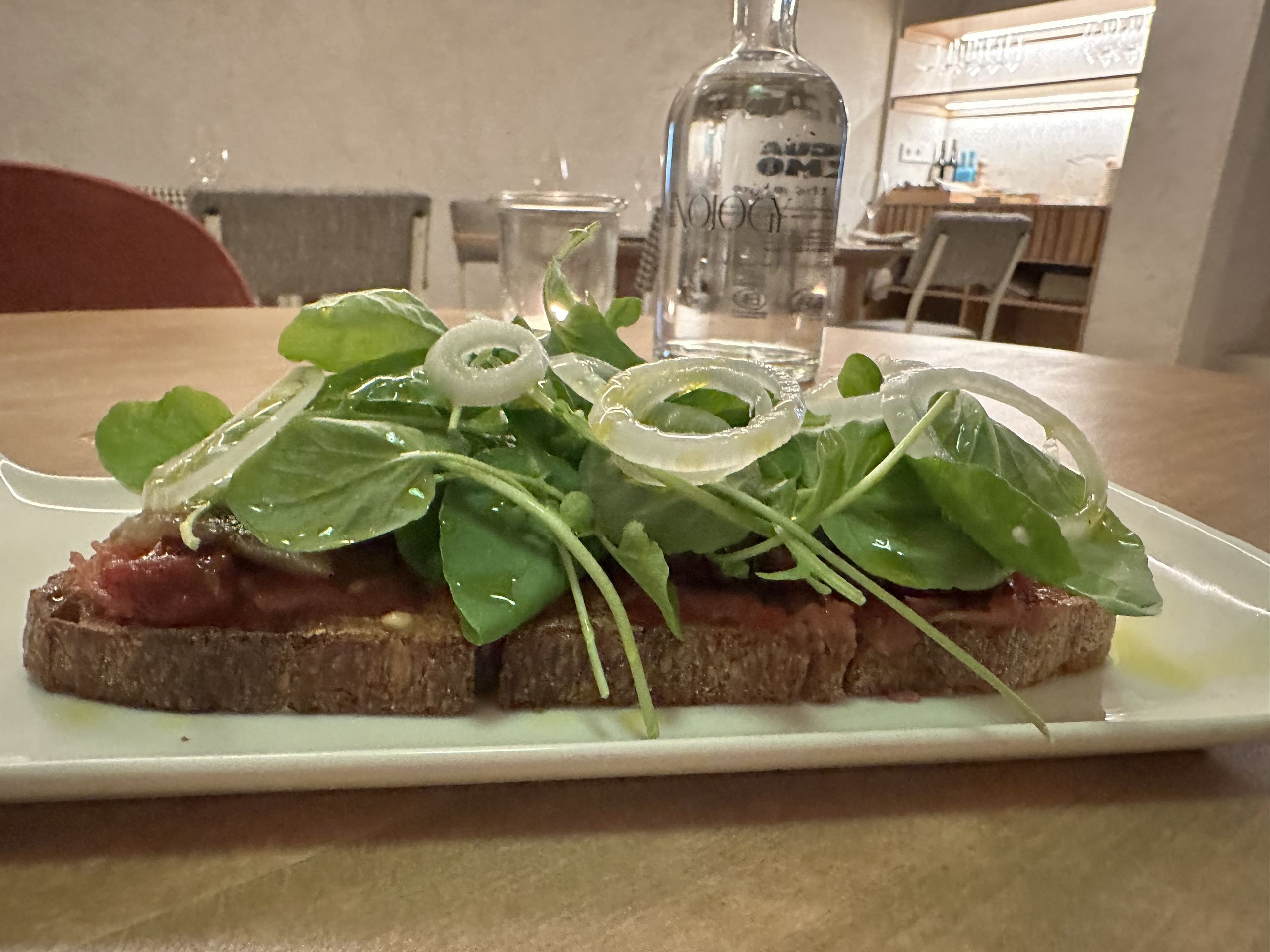 Tosta de sardina ahumada con tomate, oliva negra, berros y cebolleta.