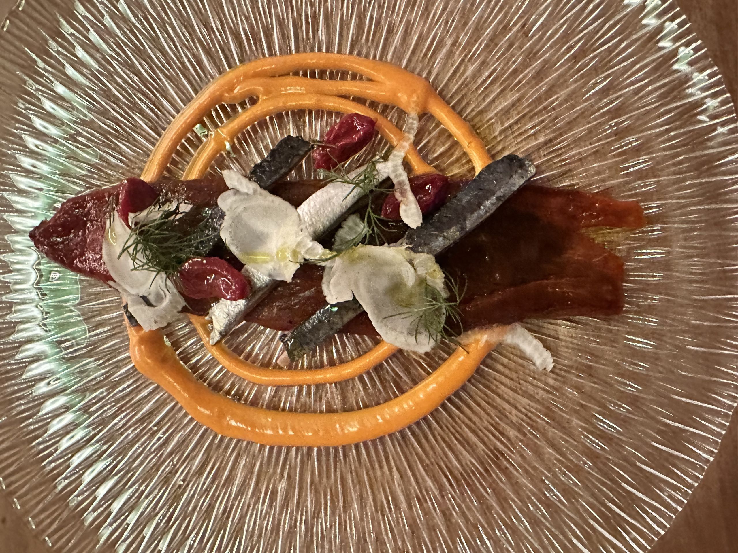 Pimientos asados al sarmiento con tomates y sardina ahumada en vinagre.