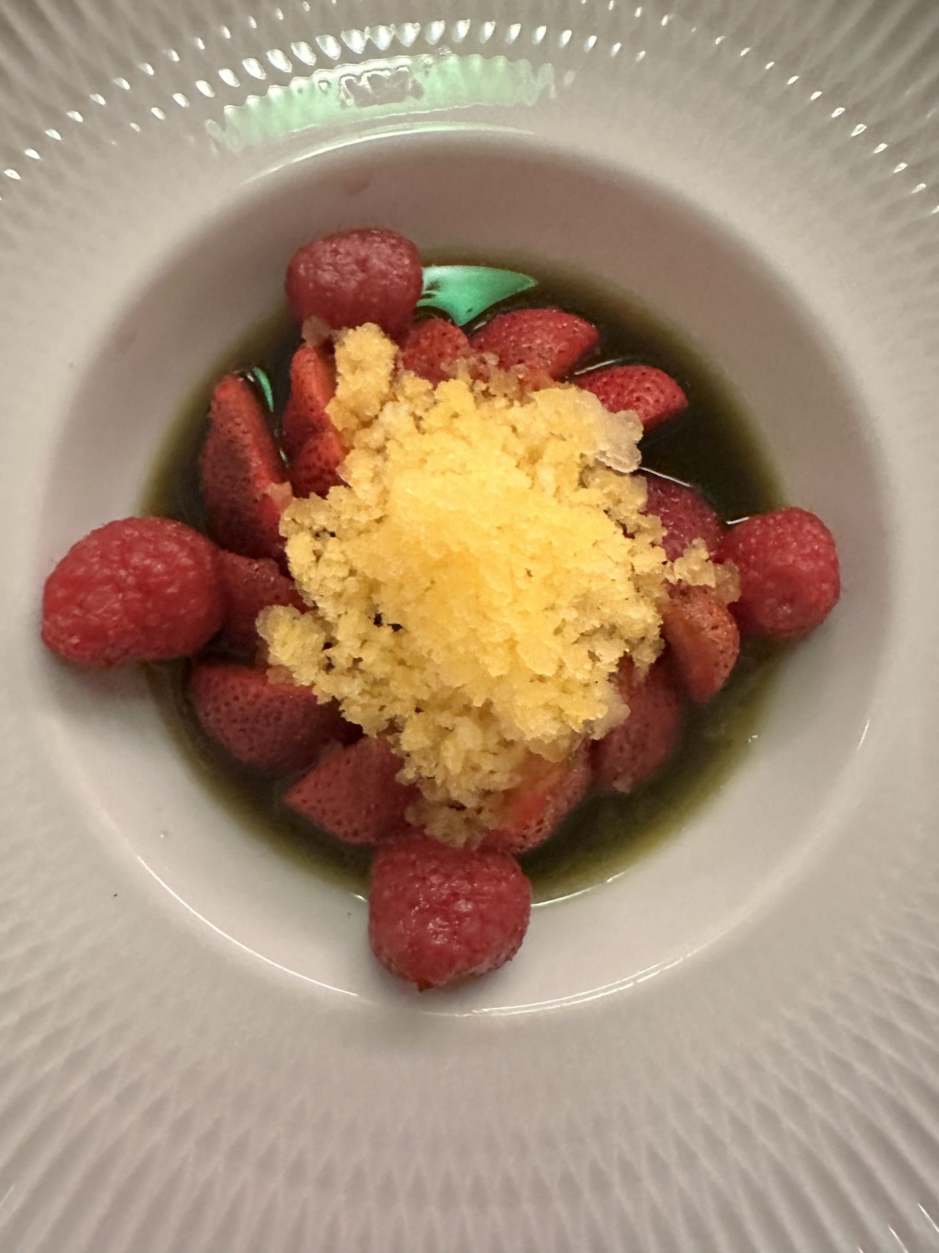 Fresas y frambuesas con salsa de albahaca y granizado de naranja.