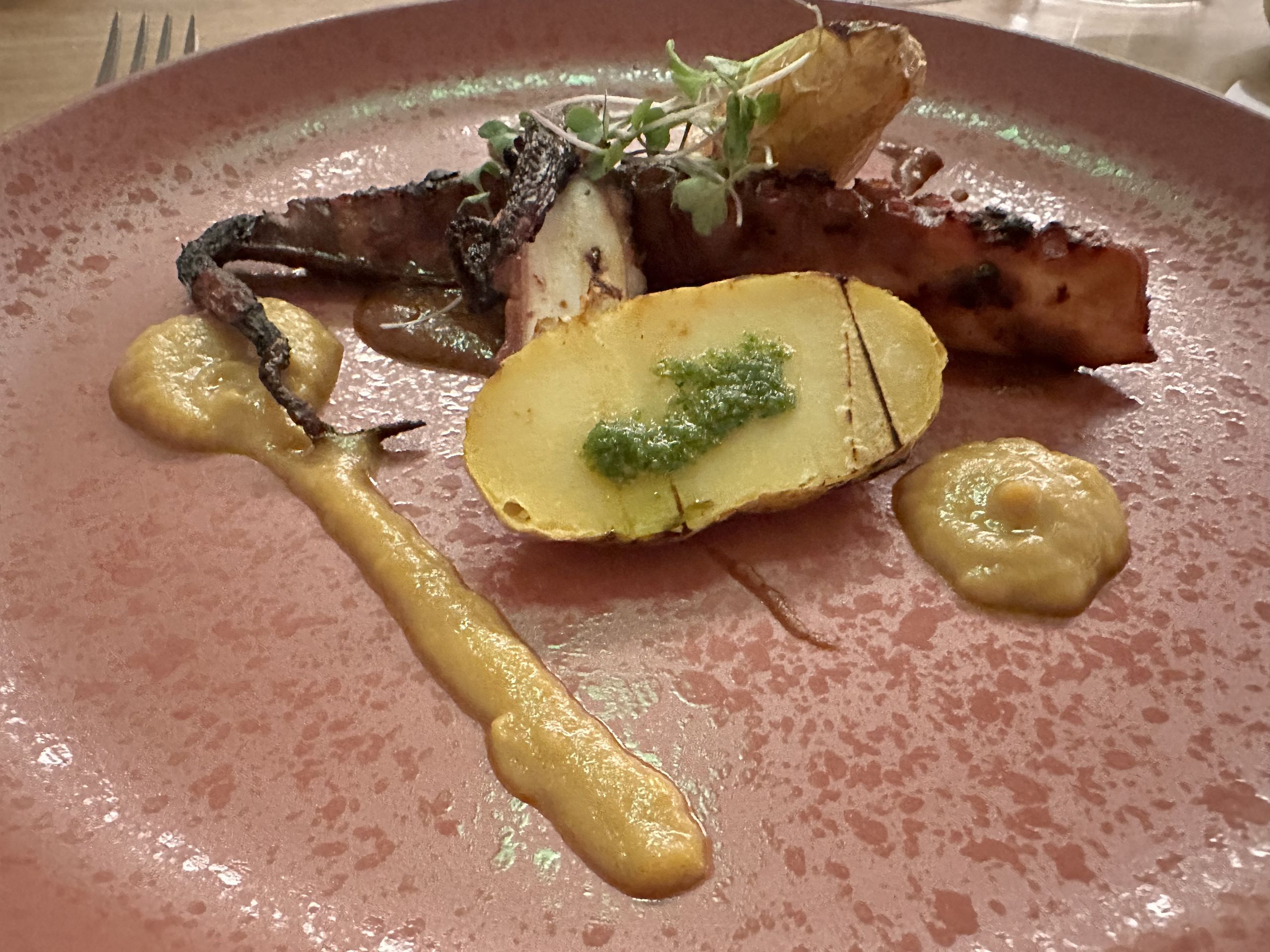 Pulpo de roca gallego asado al vino tinto con pimiento amarillo y patatas.