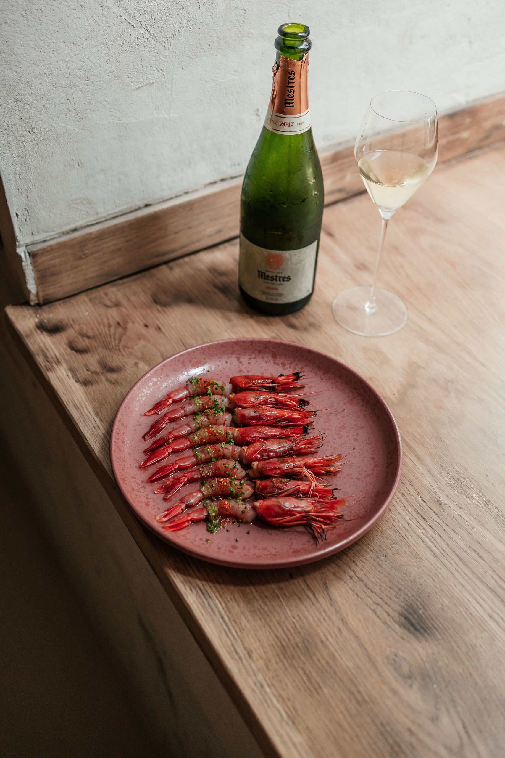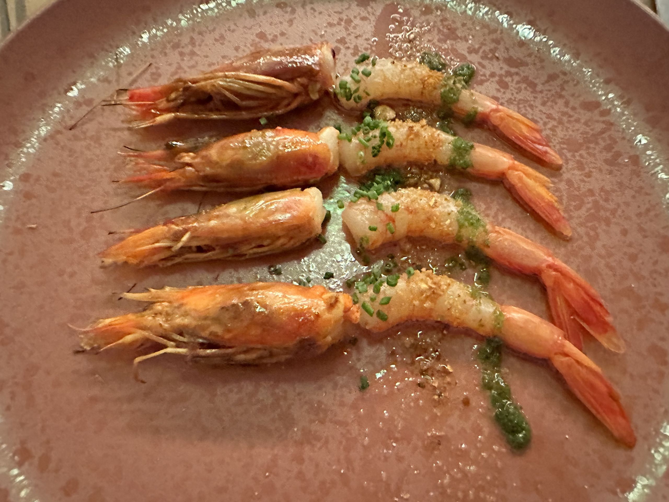 Extraordinario tiradito de gambas rojas al ajillo, manzanilla y cabezas a la parrilla. Las colas están muy poco hechas y comerse primero las cabezas es una delicia hecha ex professo para hedonistas.