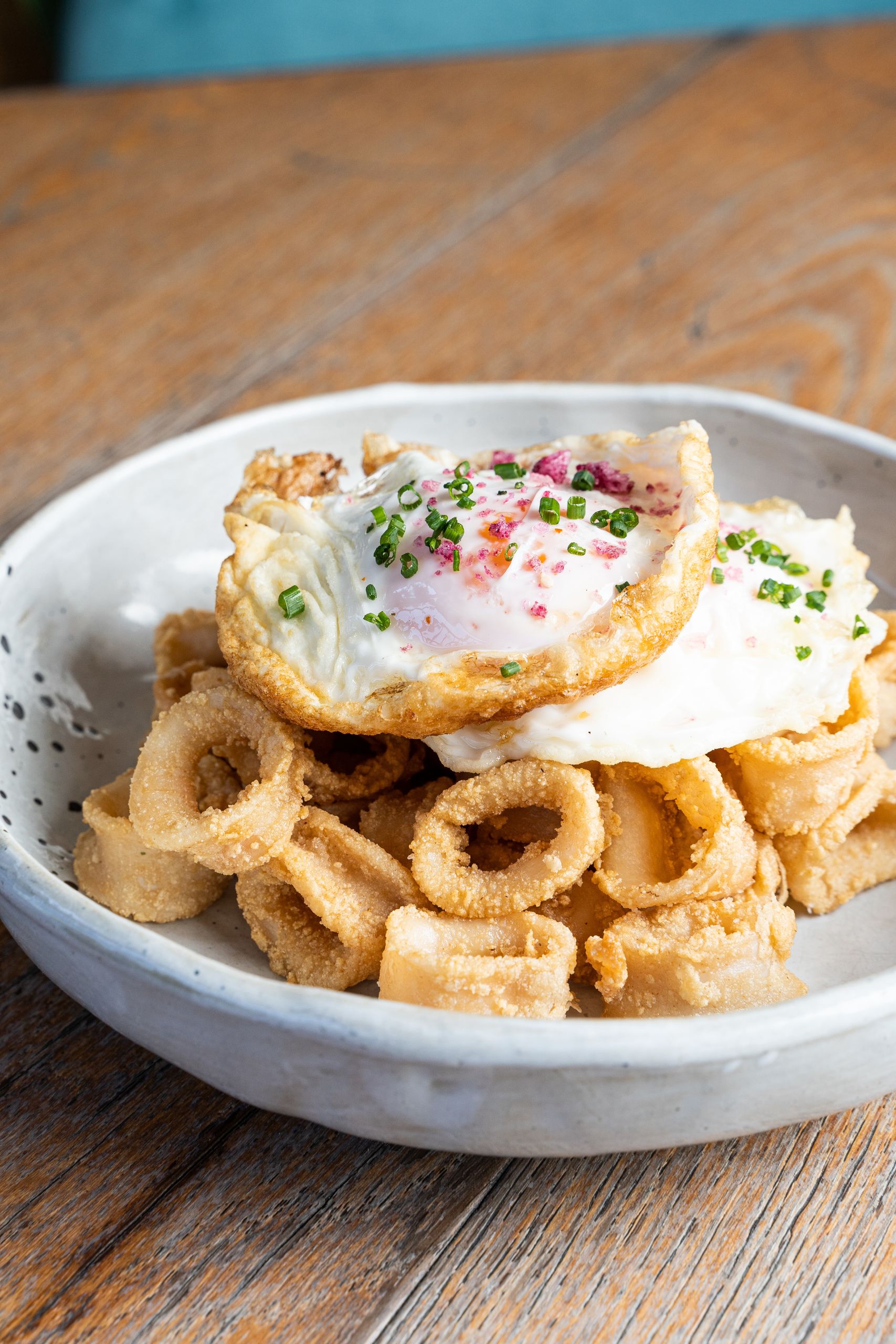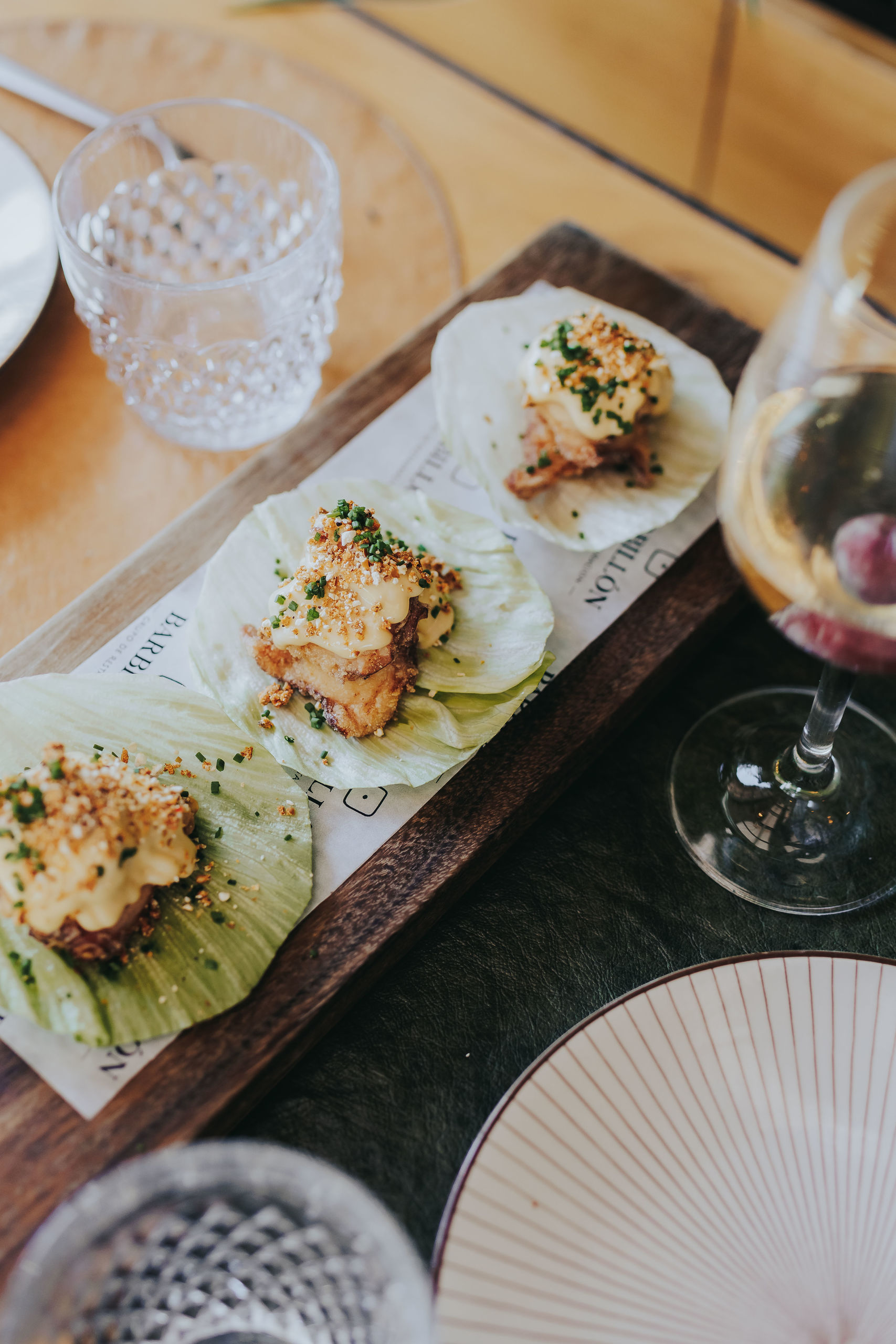 Saam de colitas de gamba en tempura japonesa, servidos sobre una hoja de lechuga y coronados con mayonesa sriracha que le aporta un ligero toque picante