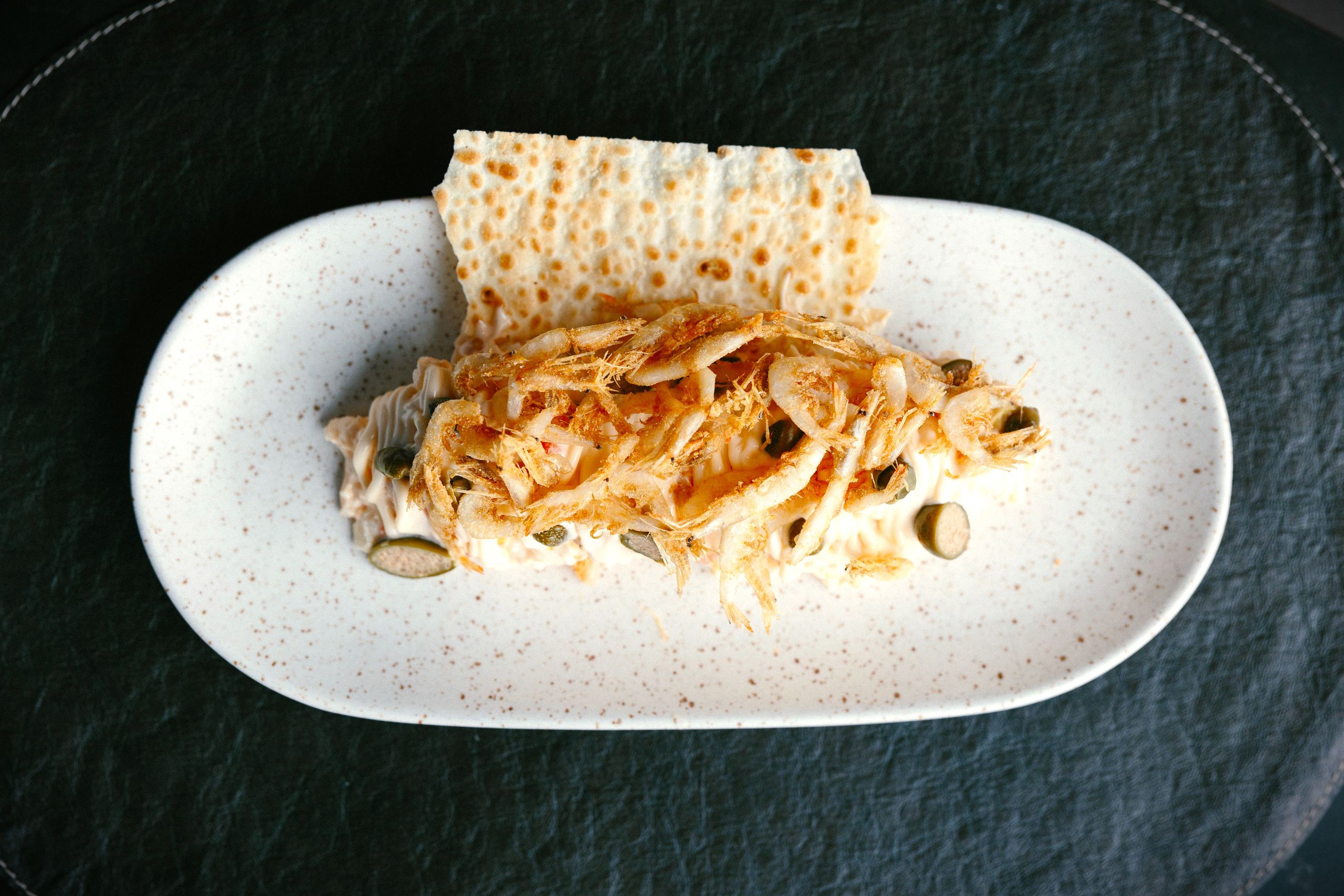 Ensaladilla rusa con la receta de la madre de los hermanos Sánchez del Amo que incluye gambas cristal fritas.