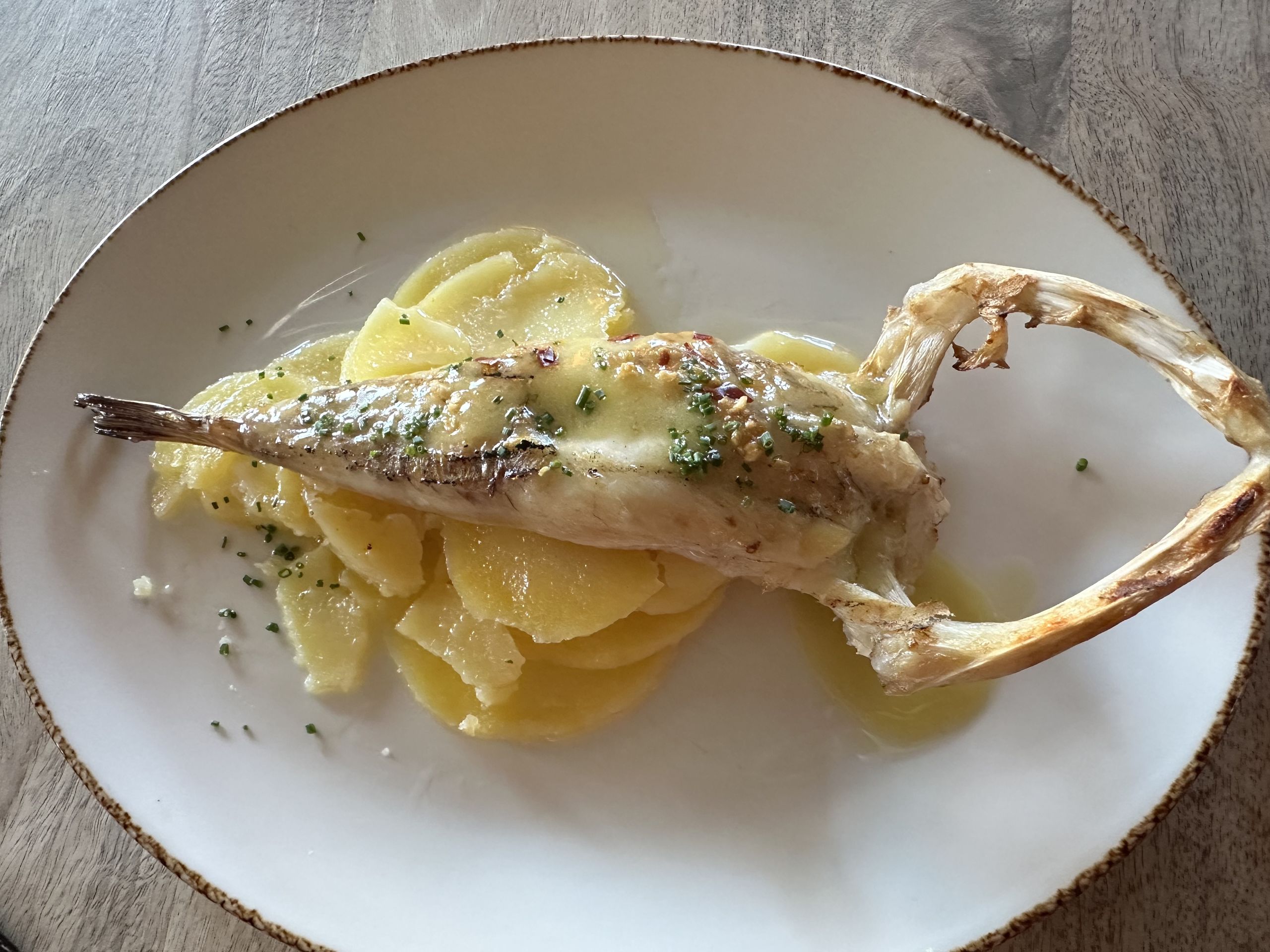 Rapito a la brasa con bilbaína y patatas fritas en dos cocciones.