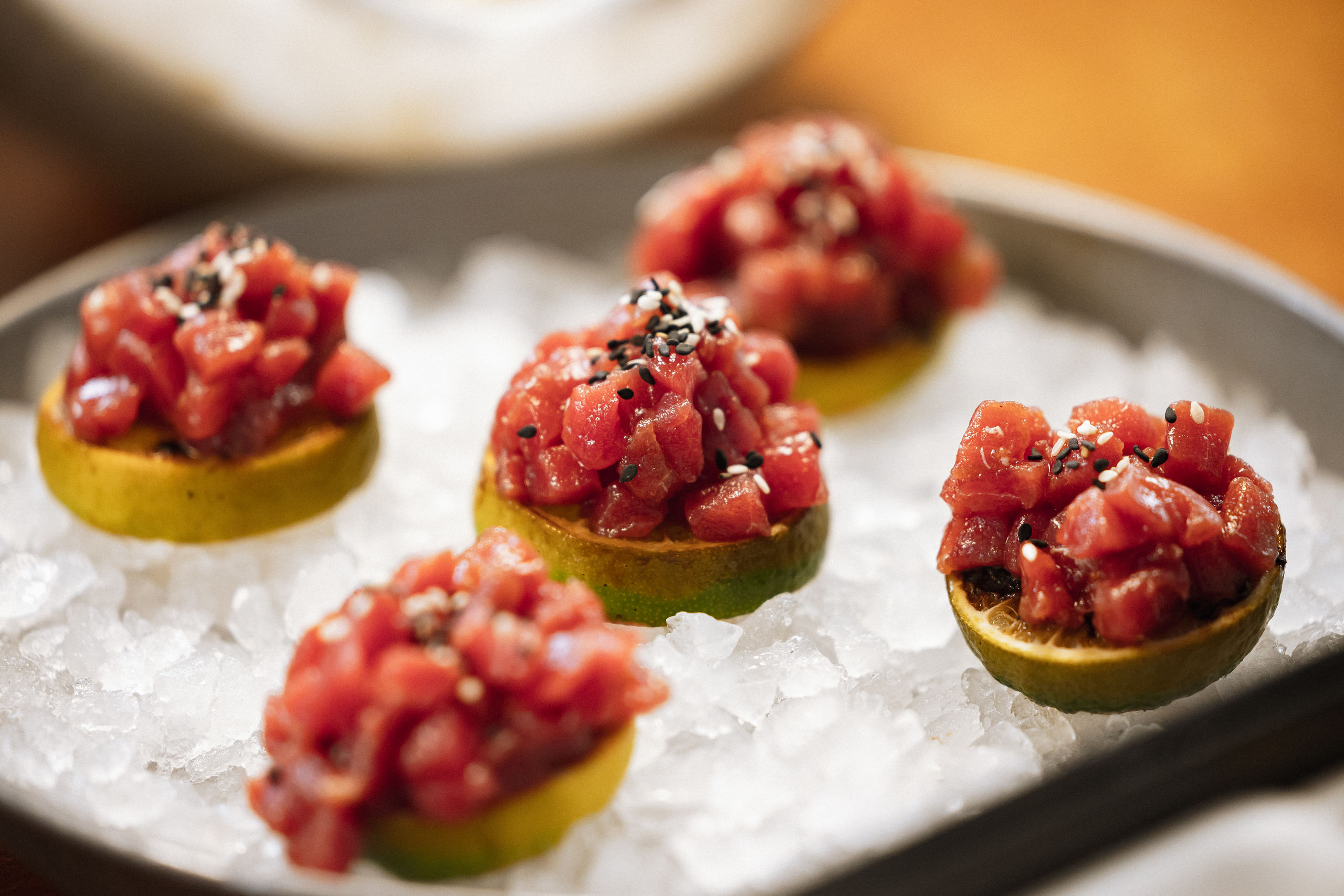 Ostra Gillardeau Nº 5 aliñada con bloodymary y otra ostra con leche de tigre de maracuyá.