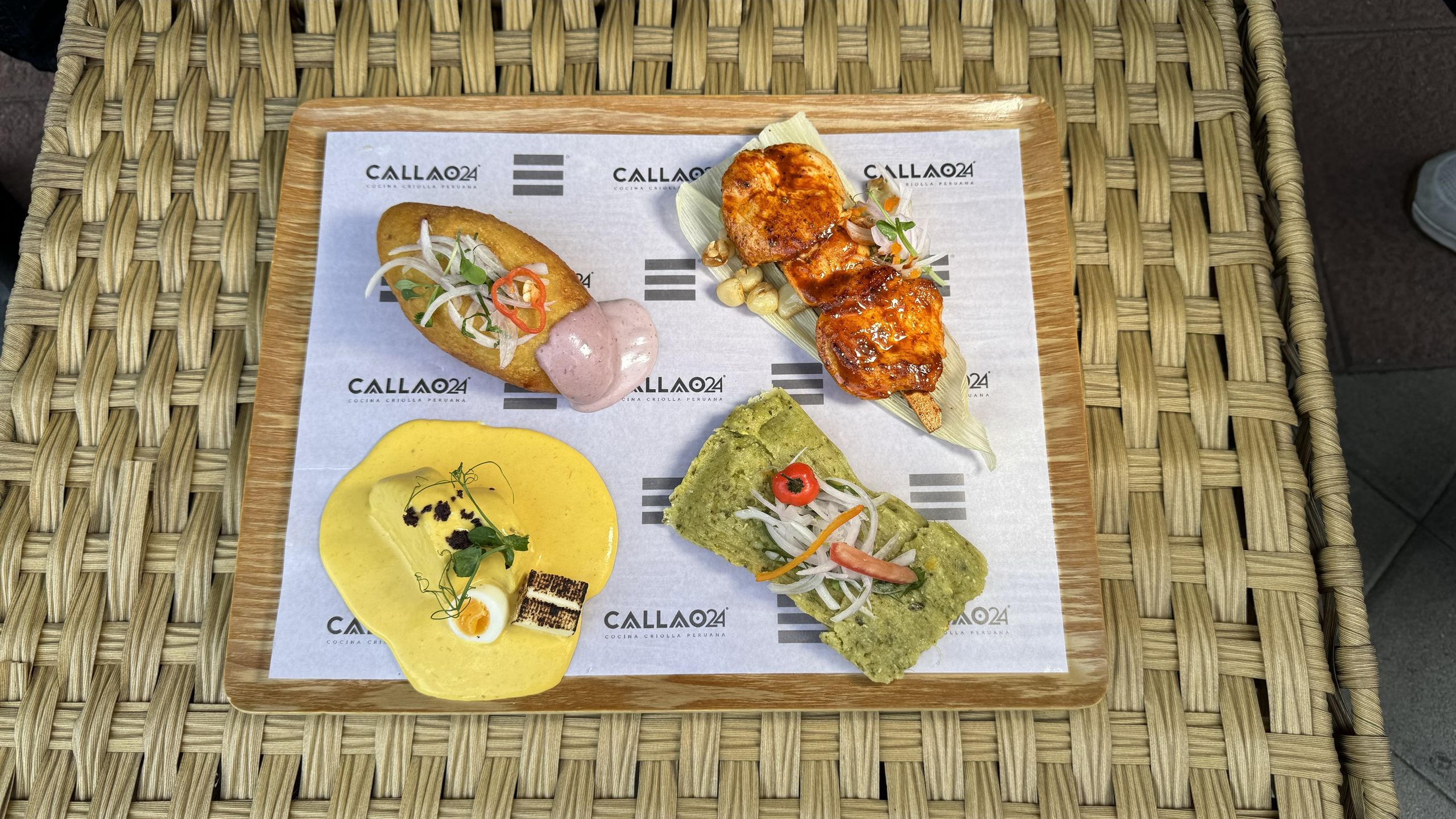 Bandeja criolla con tamalito verde; anticucho de pollo, con brocheta de pollo, ají panca, salsa criolla y huancaína; papa rellena de solomillo, aceituna, ají amarillo y mayonesa; y huancaina, un plato tradicional servido como entrante en los hogares del Perú, está compuesto a base de crema de ají amarillo, queso fresco, patata, huevo y aceitunas.