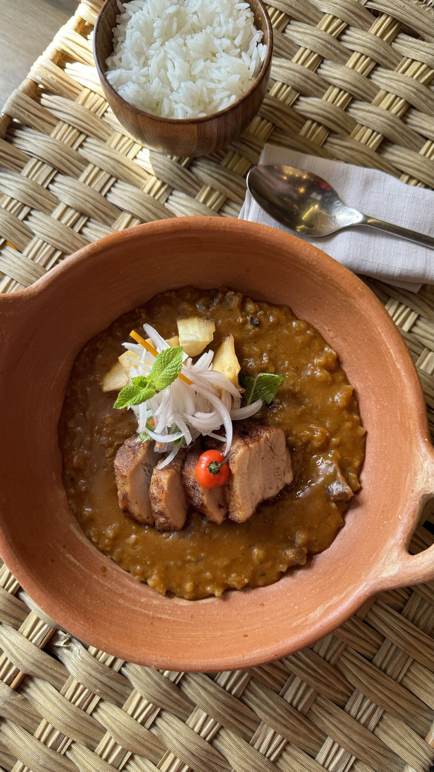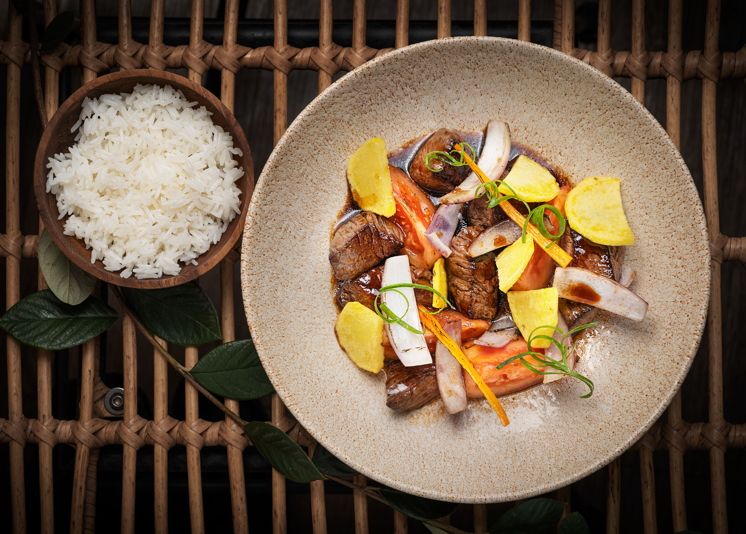 Carapulcra huaralina, un guiso del norte de Lima a base de carnes con papa seca y especias peruanas que la acompañan con arroz blanco.