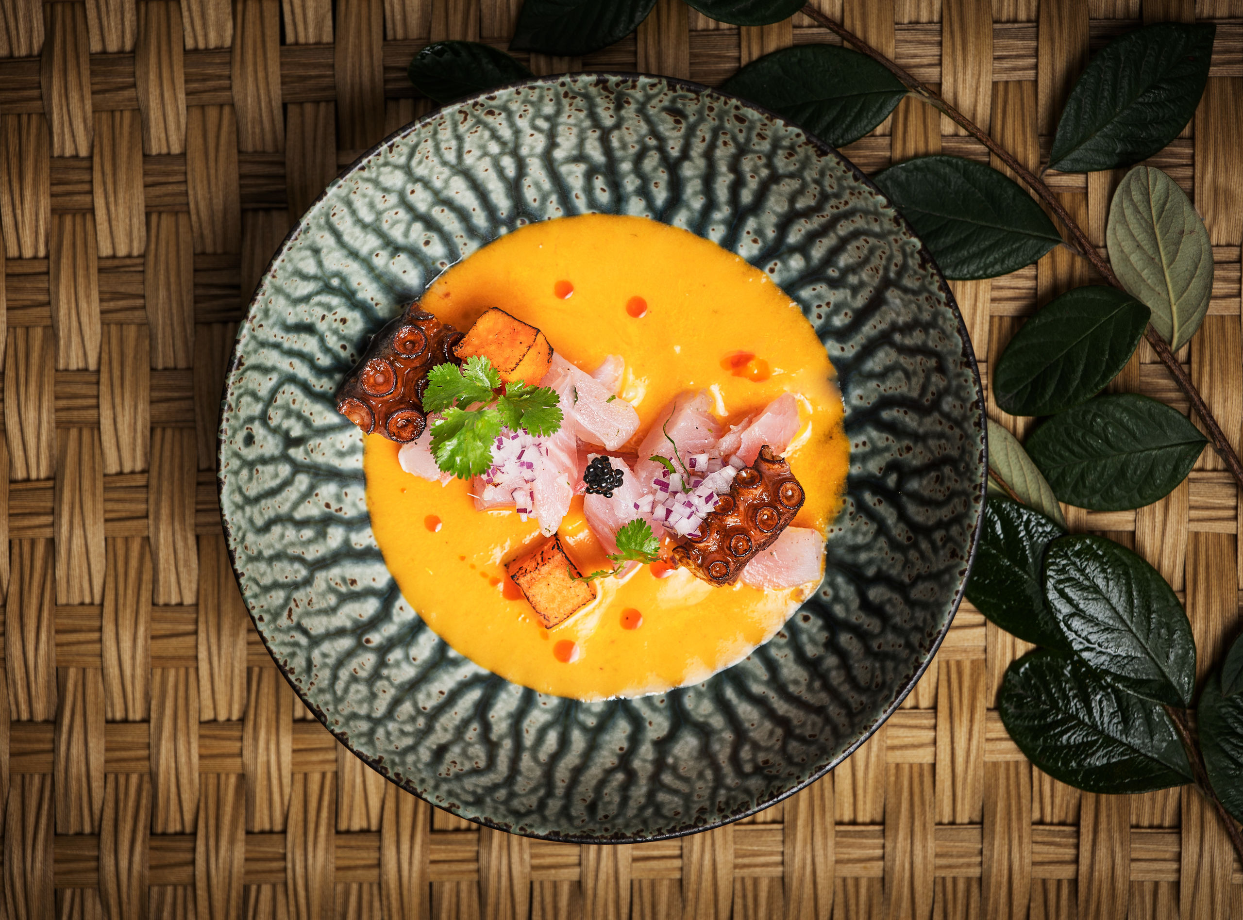 Ceviche canalla con leche de tigre, crema de rocoto y pulpo braseado.