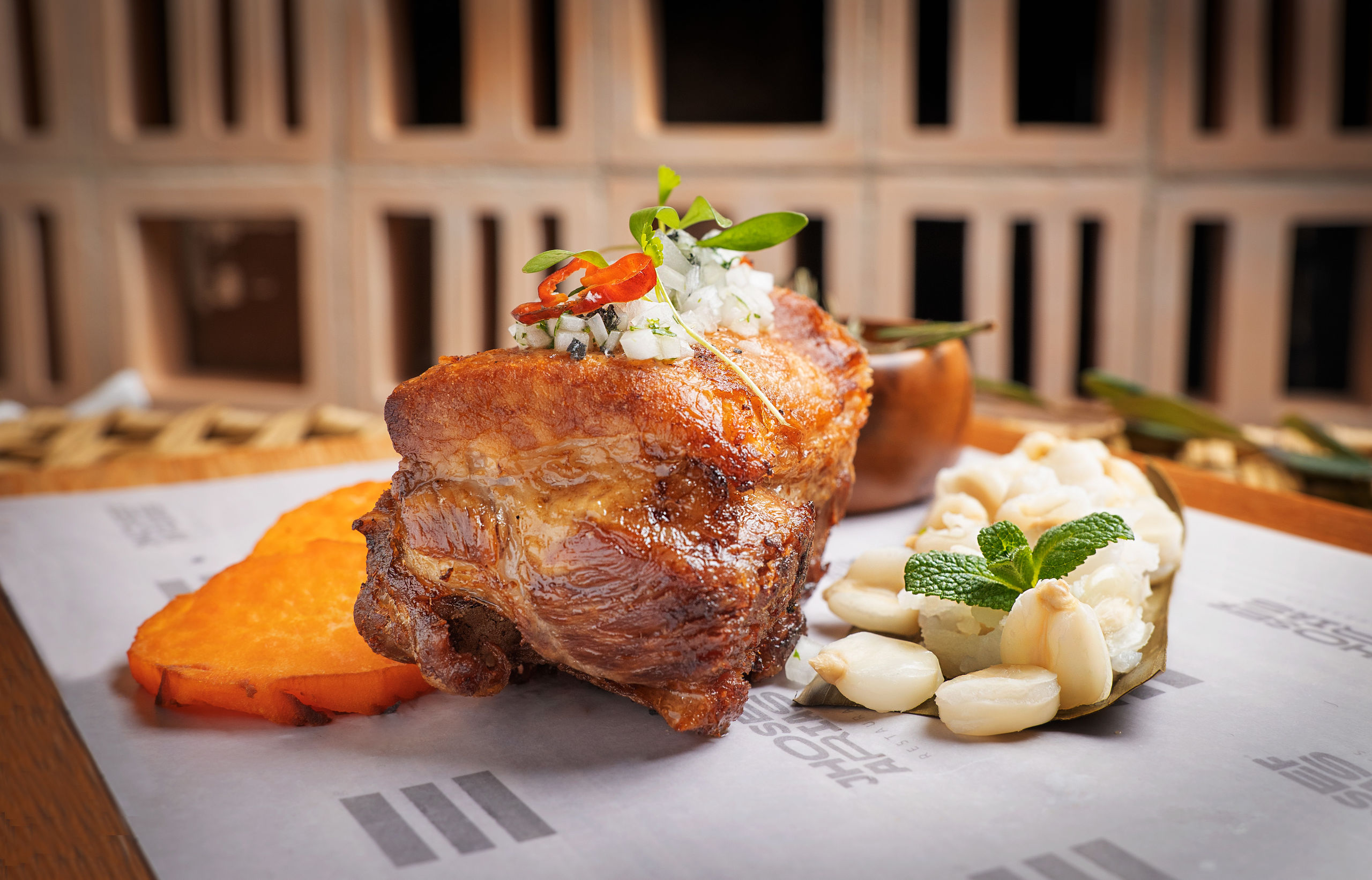 Huaralino con chanchito, salsa criolla, hierbabuena y huancaína.