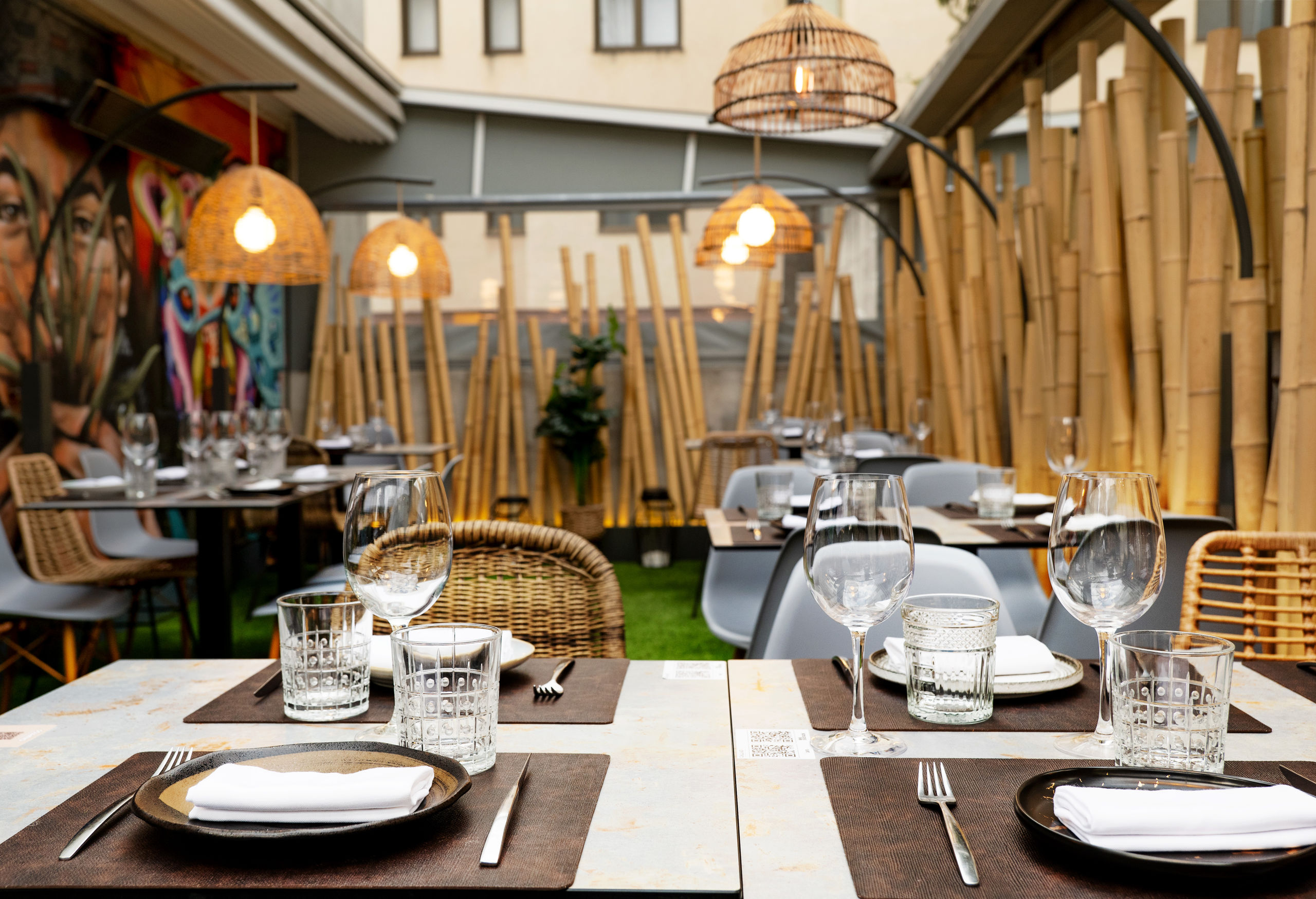 Una mesa de la terraza con un mural que recuerda la colorida decoración peruana.